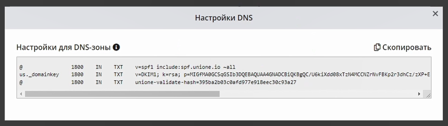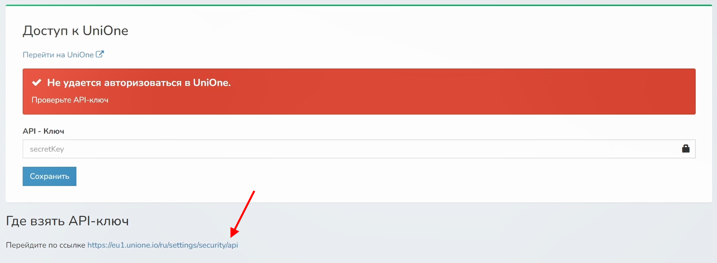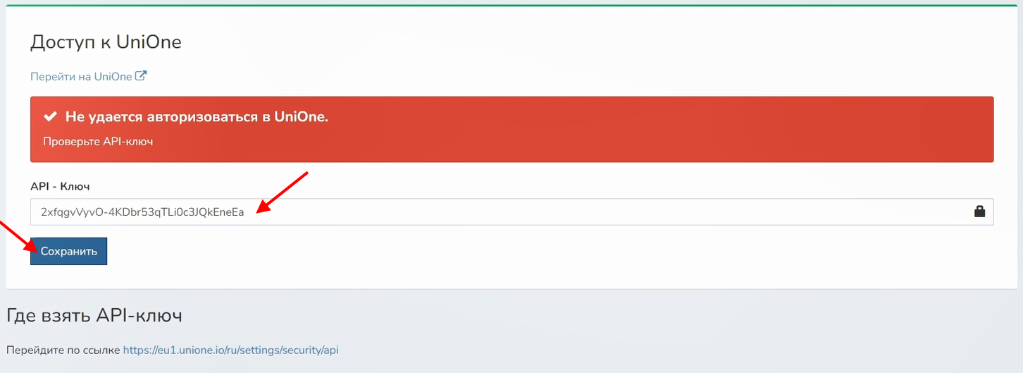 3 В поле API-ключ нужно вставить код, скопированный в вашем сервисе UniOne