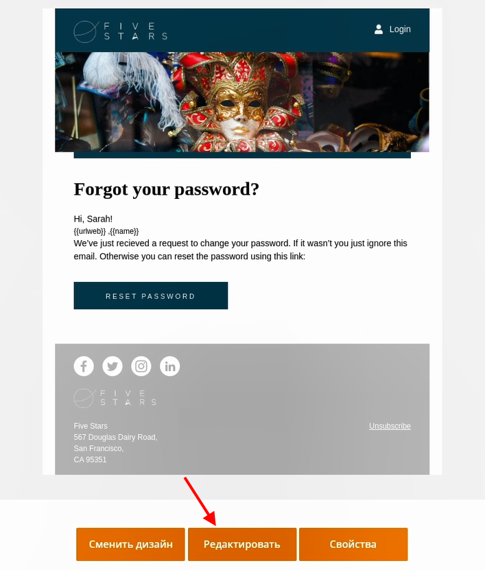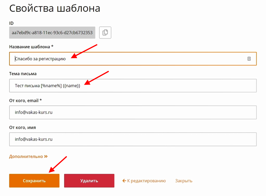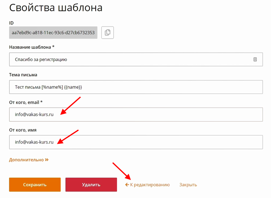 4 В свойствах шаблона укажите «Email отправителя» и «Имя отправителя». Чтобы вернуться в окно редактирования, нажмите на «К редактированию»