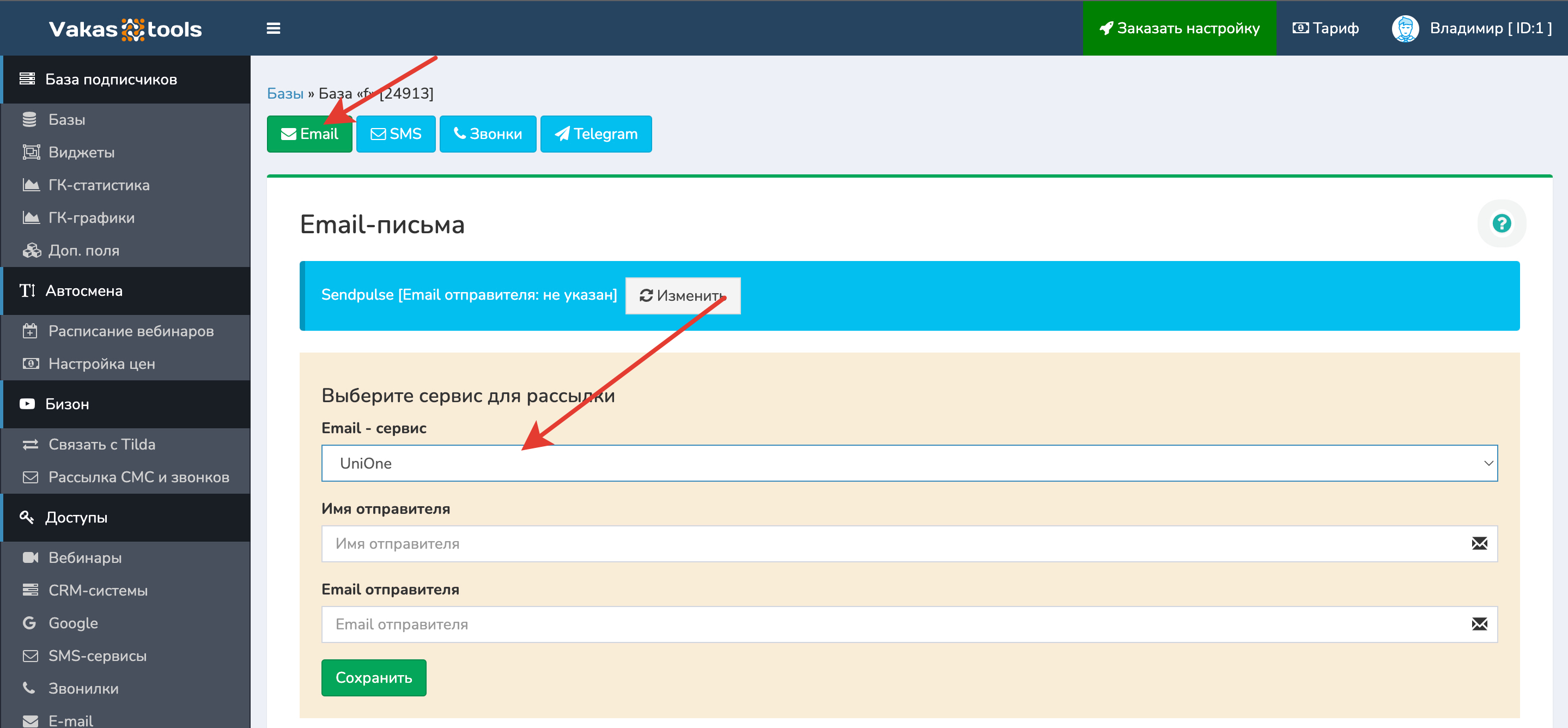 Переходите в настройку рассылки «Email». Выберите сервис UniOne, заполните «Имя отправителя» и «Email отправителя»