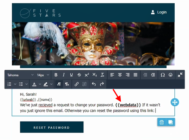 Шорткод должен обязательно выделяться двумя фигурными скобками, например {{webdata}}. Если необходимо изменить стиль данных, изменения нужно применить на шорткоды вместе с фигурными скобками. Если применить изменения только на шорткод, необходимые данные не появятся в рассылке, поскольку будет нарушен синтаксис.