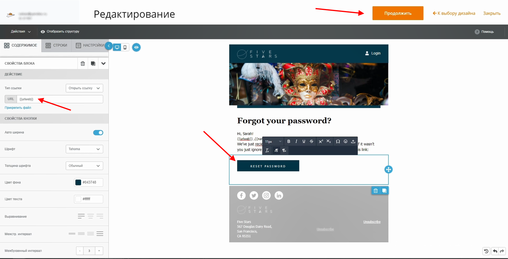 Нажмите на «Продолжить». В свойствах шаблона заполните «Название шаблона» и «Тему письма». Нажмите на «Сохранить»