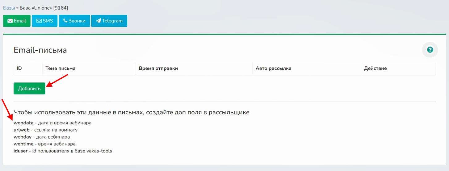 Настройка рассылки в базе Vakas-tools