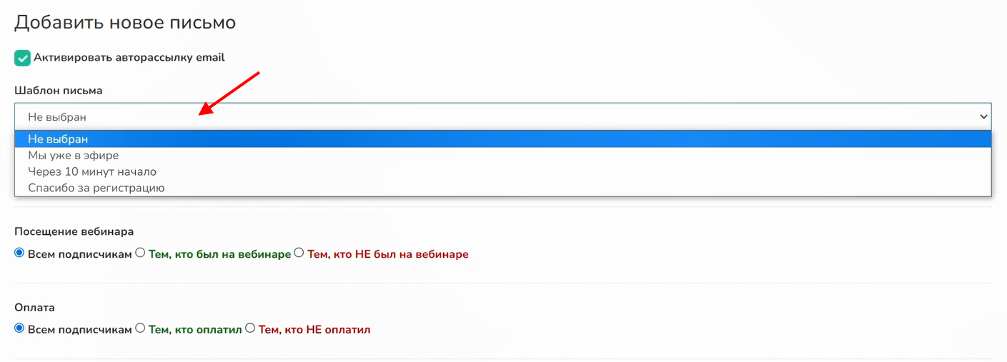 Для этого используются параметры «Тем, кто был на вебинаре» и «Тем, кто НЕ был на вебинаре». Аналогично можно направить рассылку тем, кто оплатил, и тем, кто не оплатил. Для этого регистрация участников и отчеты должны быть в одной базе.