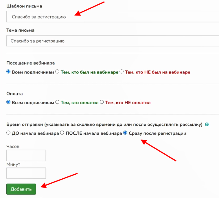 5 Для создания рассылки, направляемой после регистрации участника, устанавливаем время отправки «Сразу после регистрации»