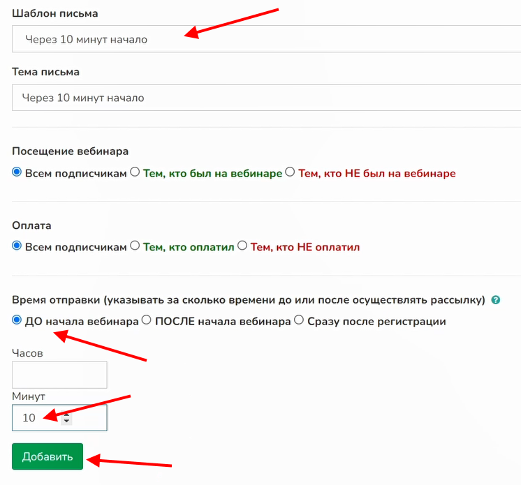 6 Для рассылки с напоминанием о вебинаре за 10 минут до его начала устанавливаем время отправки «ДО начала вебинара» и количество минут 10