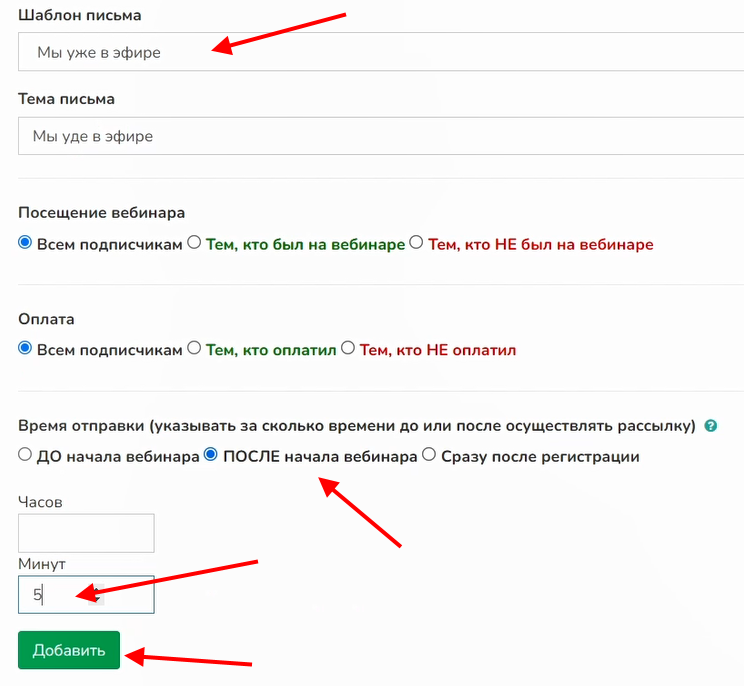 7 Для рассылки о том, что вебинар уже начался, устанавливаем время отправки «ПОСЛЕ начала вебинара» и нужное количество минут с начала вебинара