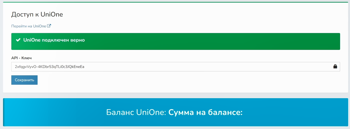 6 Если UniOne подключен верно, появится баланс сервиса