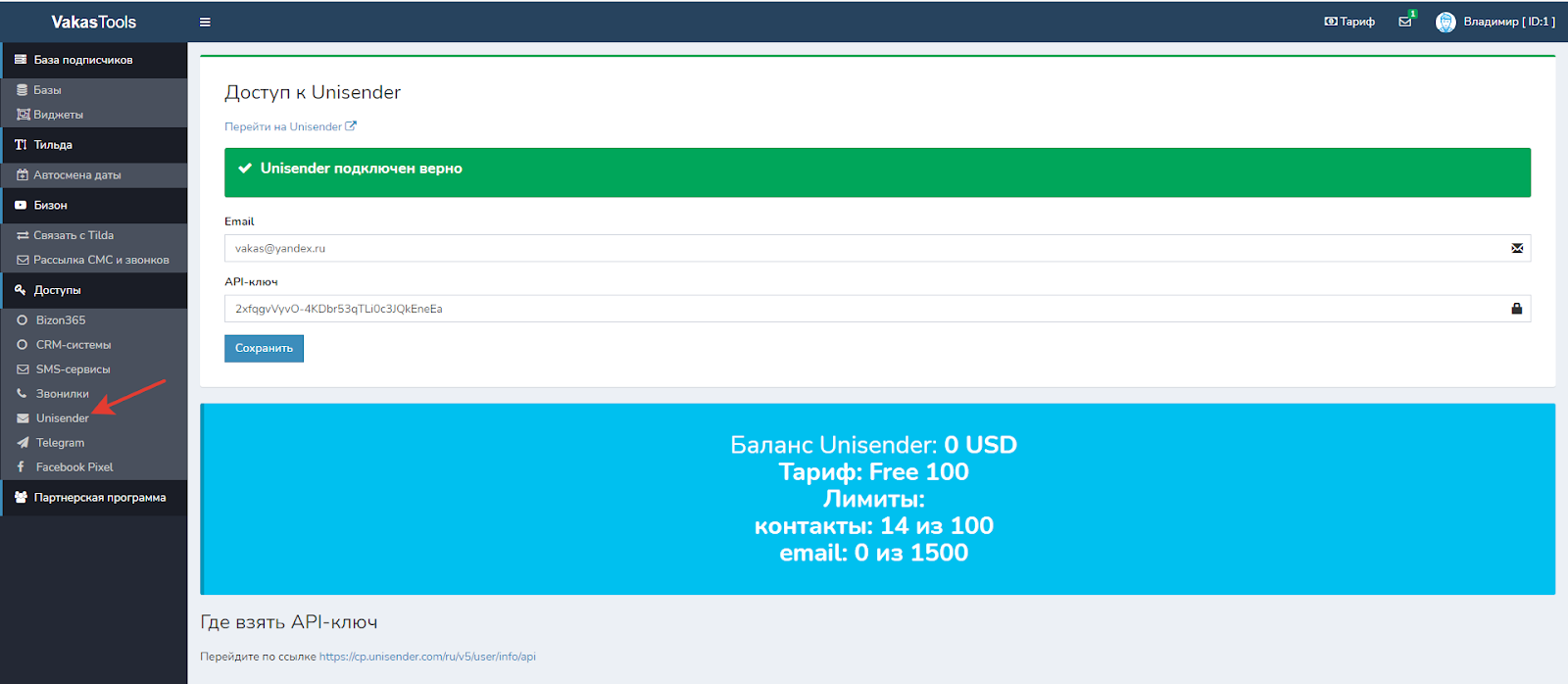 3 В доступах прописать API-ключ для «Unisender»
