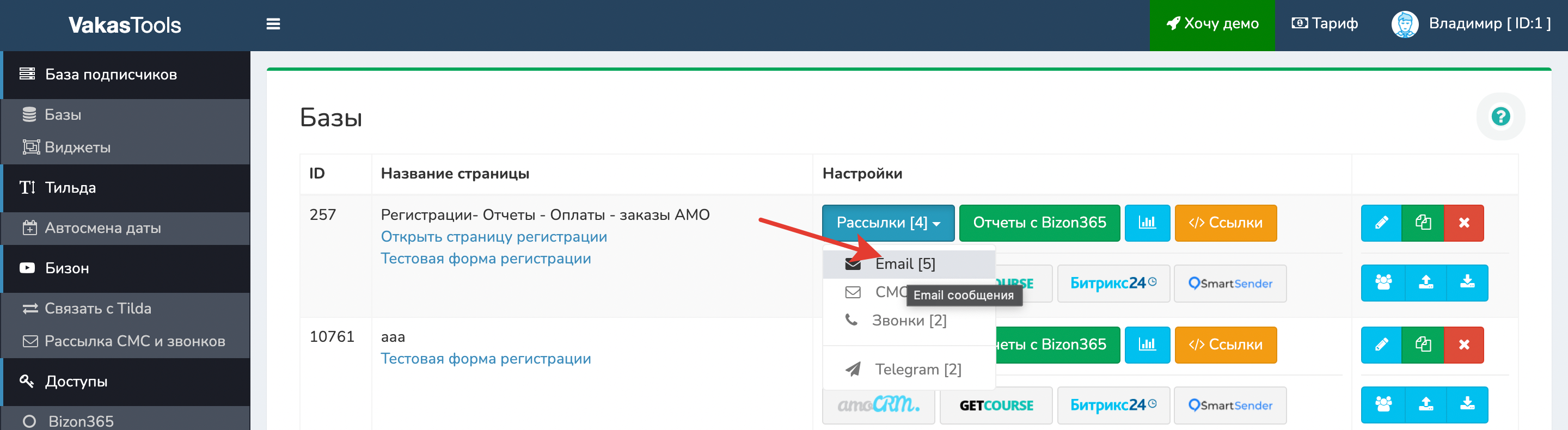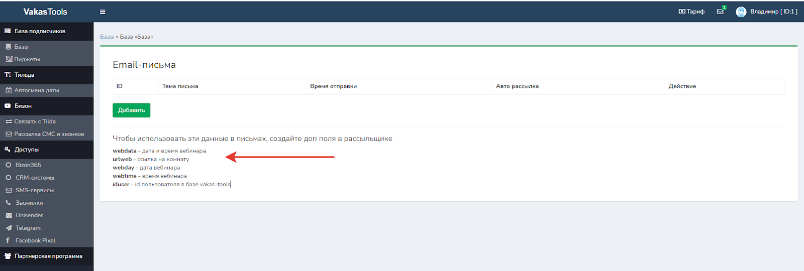 1 У нужной базы нажимаете кнопку [Email письма]