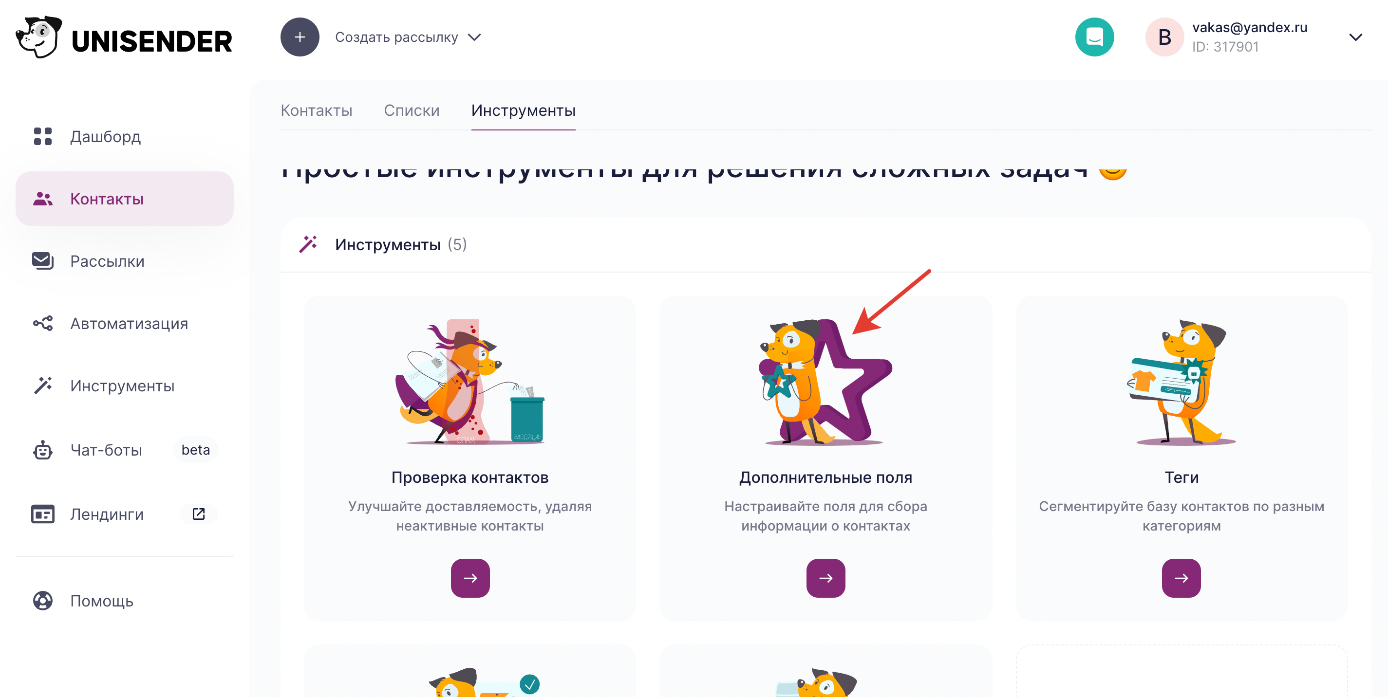 3 В Unisender идем в Контакты > Инструменты > Дополнительные поля