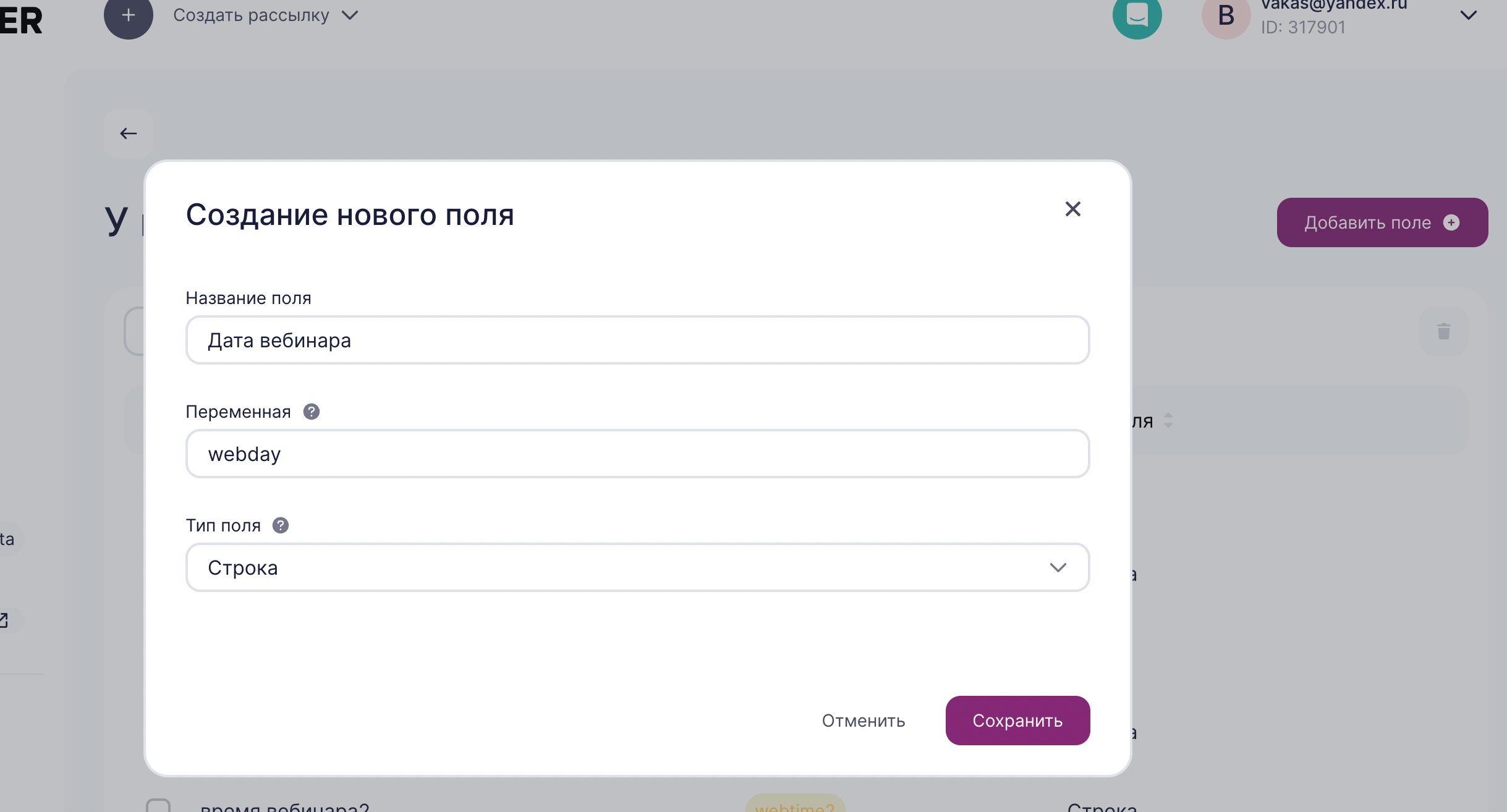 Создание дополнительных полей в Unisender
