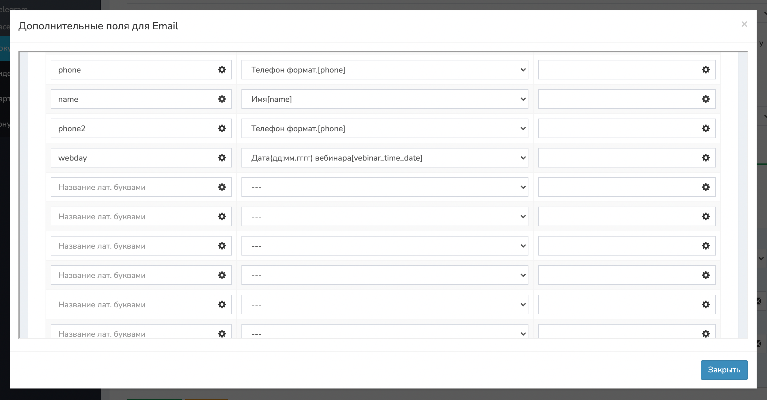 Если нужны другие доп. поля, спускаетесь ниже в настройке Email-писем и по кнопке [Указать свои доп. поля в email-сервисе] можно создать свои доп. поля. Не забудьте создать их и в Unisender. Главное, чтобы названия совпадали в vakas-tools и Unisender.