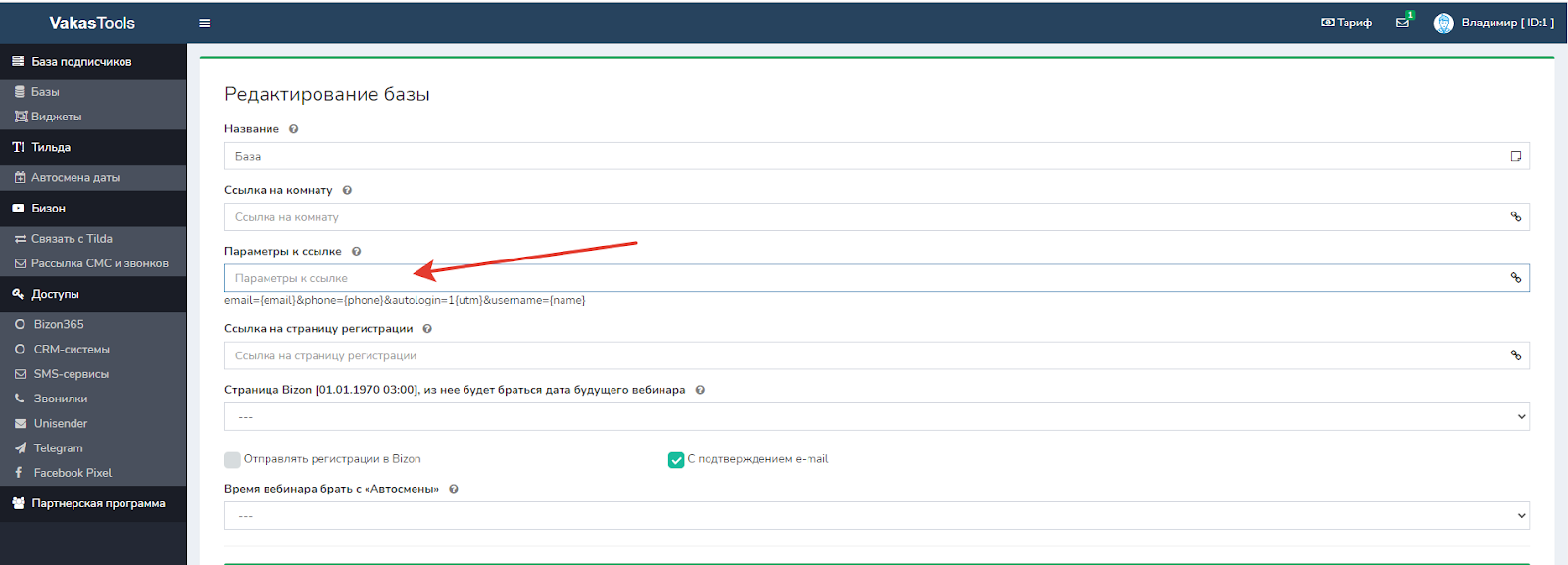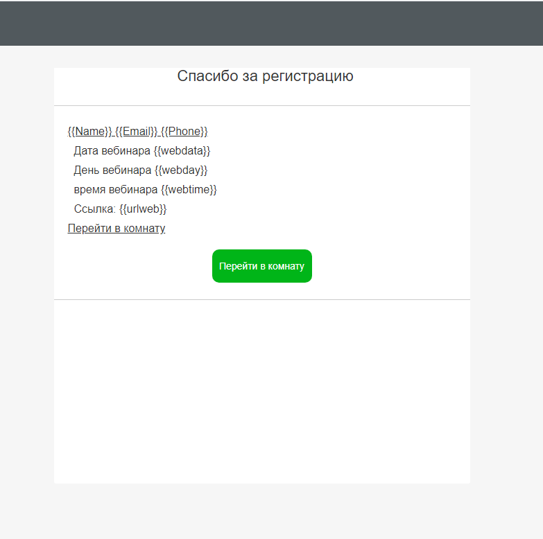 email={email}&phone={phone}&autologin=1{utm}&username={name}, которые формируют ссылку на комнату для пользователя, чтобы ему не приходилось повторно вводить свои данные. Если хотите поменять параметры, то вставляете свои. Если требуется их изменить (убрать автовход или автозаполнение формы входа данными, полученными от участников вебинара при регистрации), копируем указанные параметры в поле и редактируем. Чтобы убрать автовход, удаляем из строки &autologin=1.