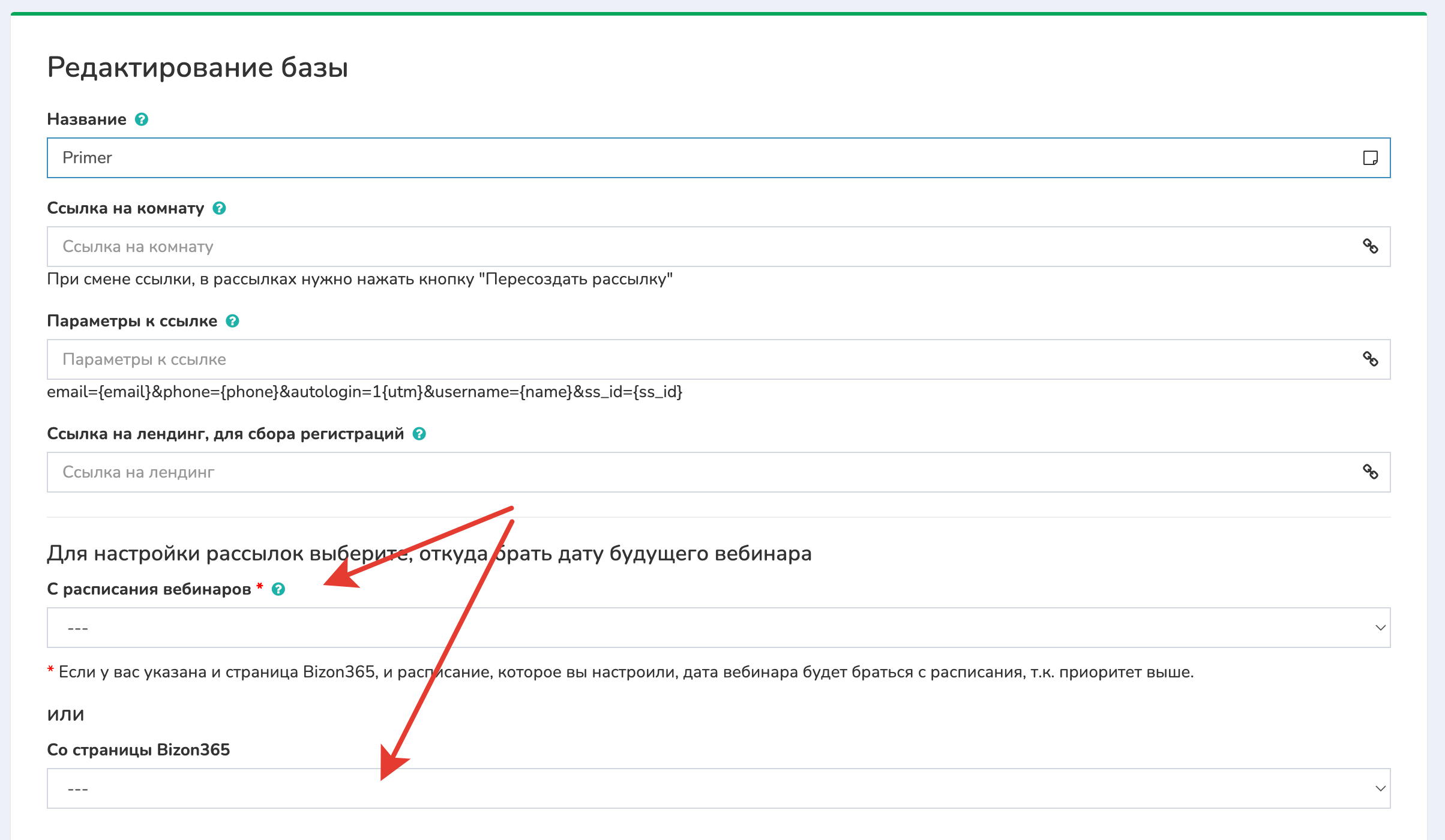 3 Выбираете откуда брать дату вебинара, со страницы Bizon365 или с «Расписания вебинаров», которое вы настроили заранее