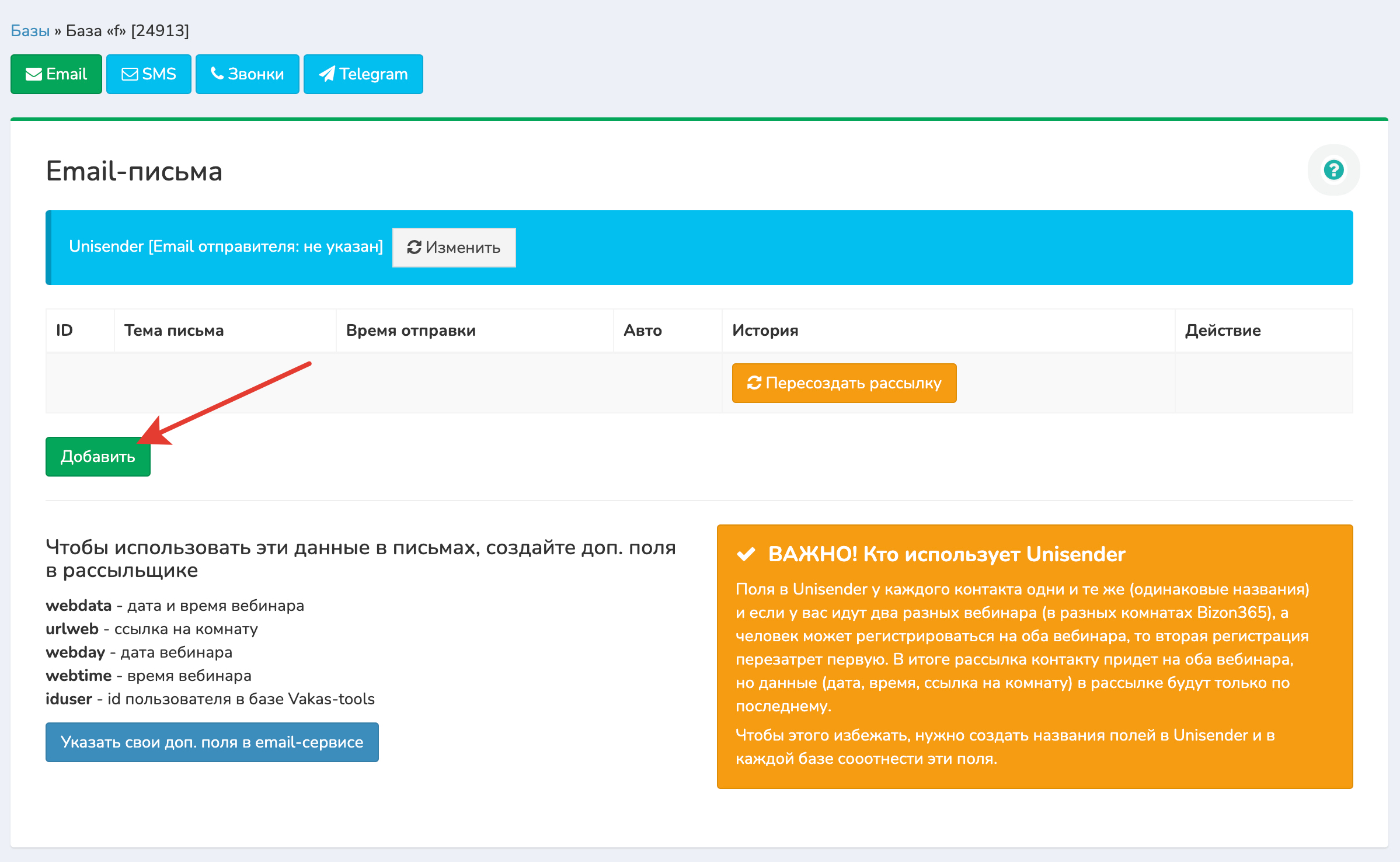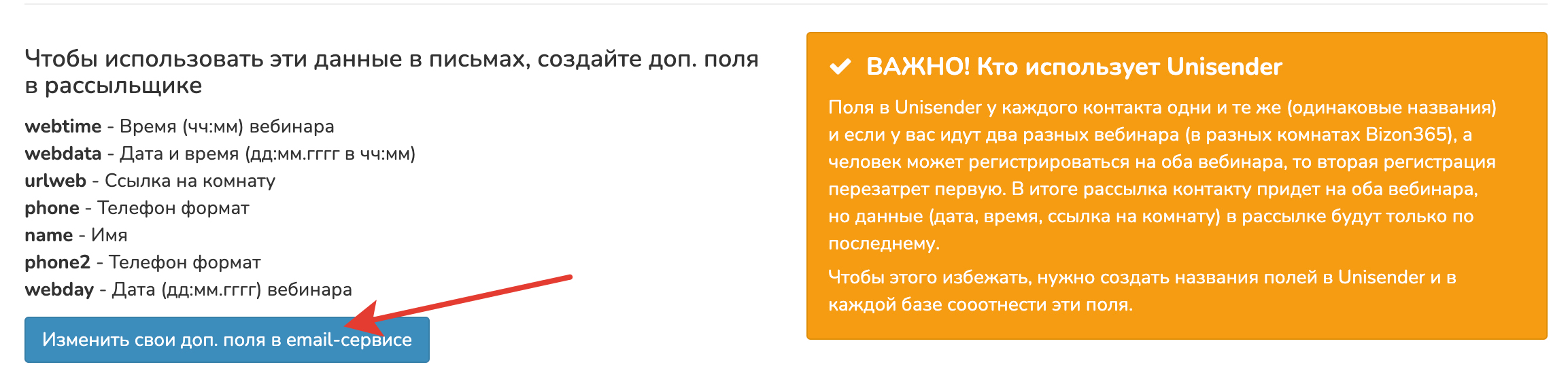 Зачем создавать свои доп. поля: т.к. поля в Unisender у каждого списка контактов одни и те же (одинаковые названия) и если у вас идут два разных вебинара (в разных комнатах Bizon365), а человек может регистрироваться на оба вебинара, то вторая регистрация перезатрет первую. В итоге рассылка контакту придет на оба вебинара, но данные (дата, время, ссылка на комнату) в рассылке будут только по последнему. Чтобы этого избежать, нужно создать названия полей в Unisender и в каждой базе соотнести эти поля.