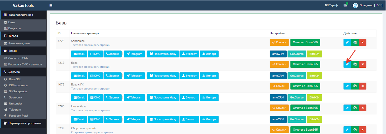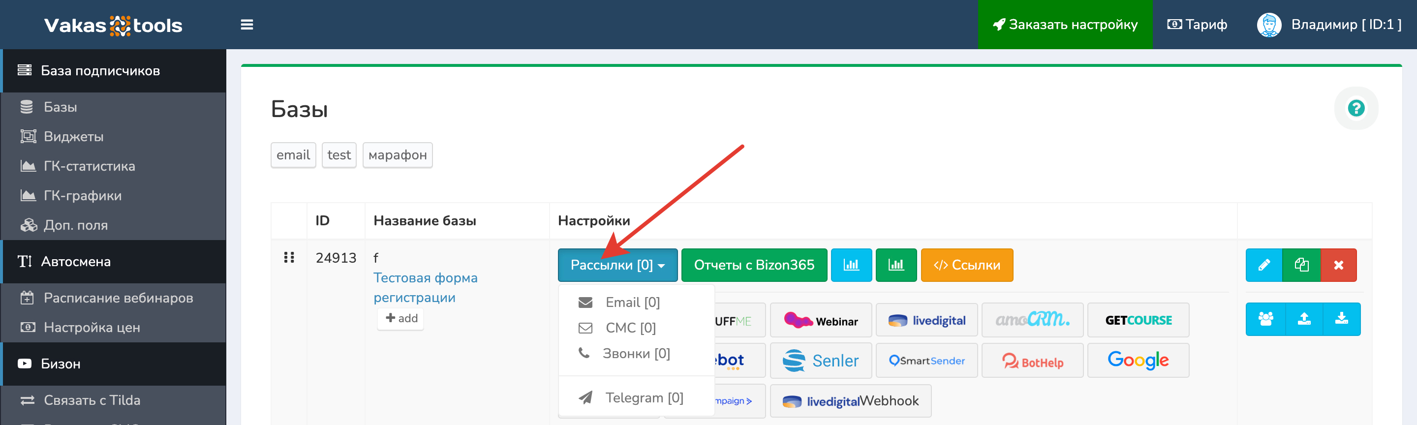 1 Заходите в редактирование базы, у которой хотите создать рассылку