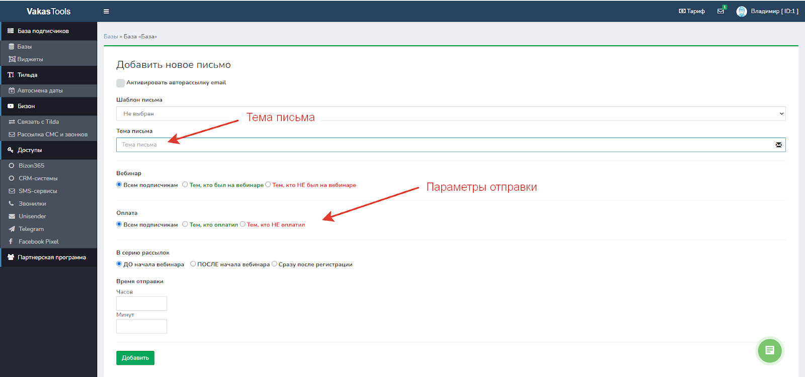 Например вебинар в 20.00, создаете рассылку писем за час, тогда пишите в Время отправки 1 час 0 минут, если рассылка за 10 минут, пишите 0 часов 10 минут.