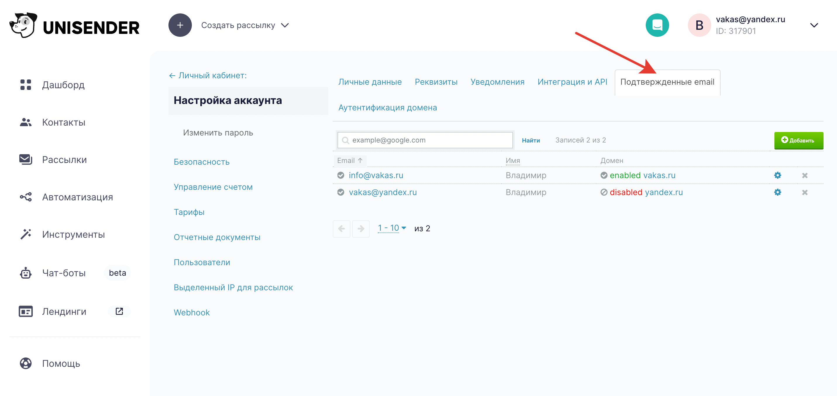 2 Прописываете email — логин в Unisender