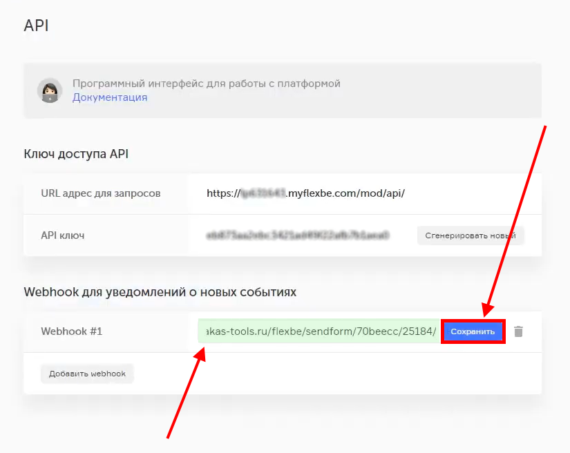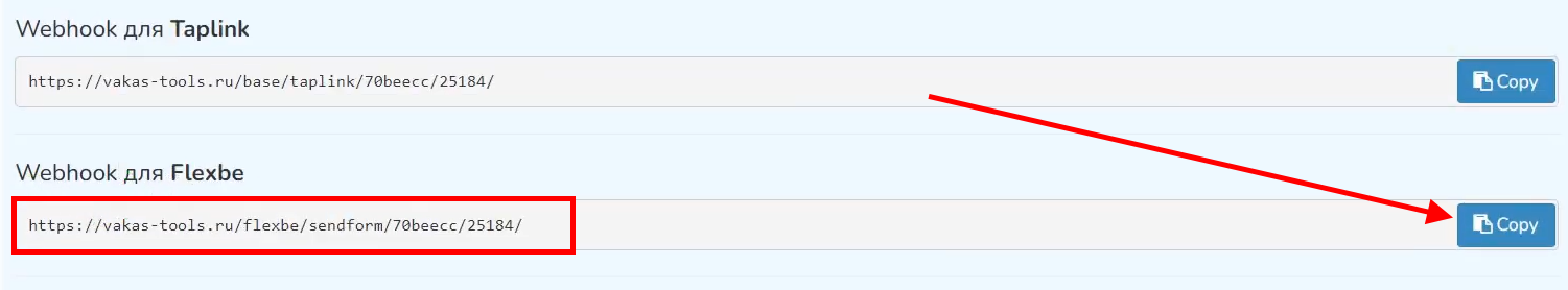 2. В разделе «Регистрации» найдите «Webhook для Flexbe» и скопируйте его.