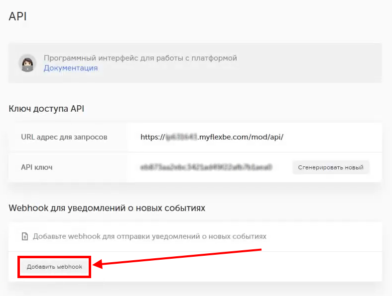 7. Нажмите на «Добавить webhook» в разделе «Webhook для уведомлений о новых событиях».