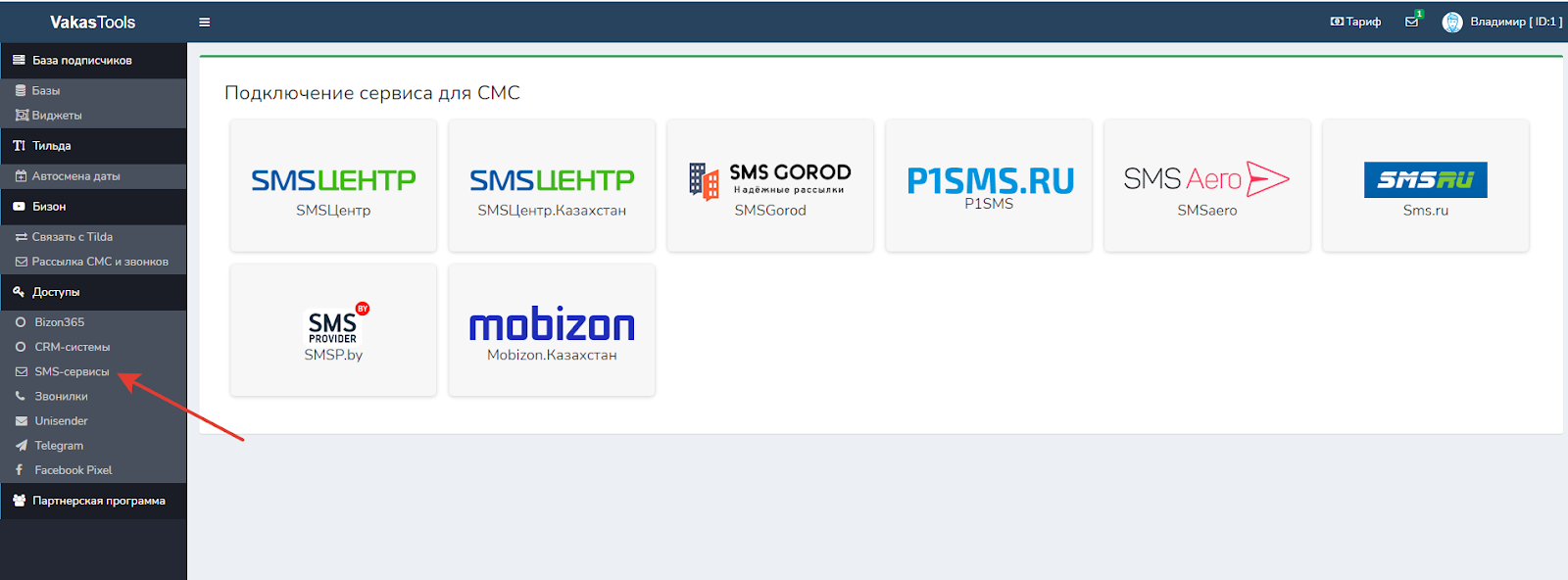 3 Выберите во вкладке «СМС» нужный СМС-сервис из выпадающего списка