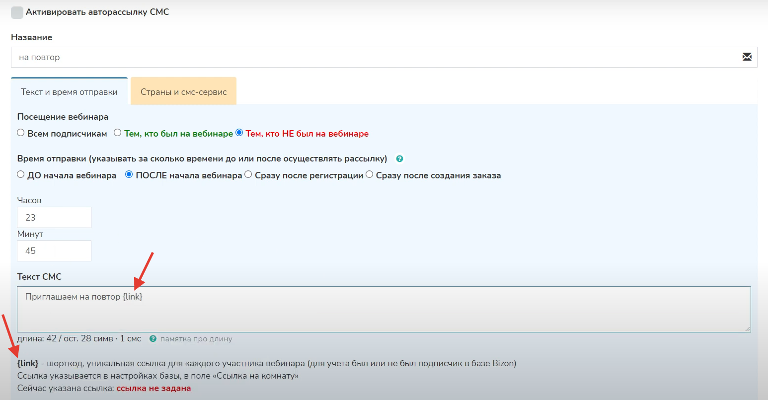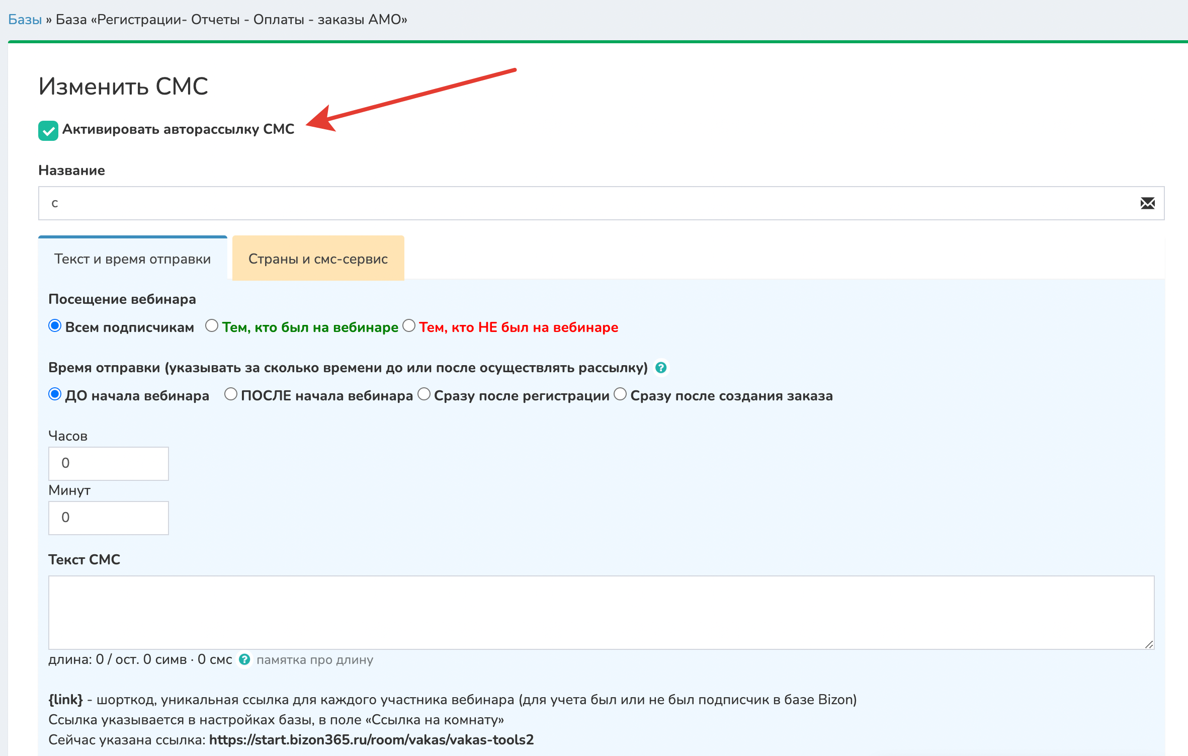 В настройках базы должна быть обязательно указана ссылка на комнату. Если она указана, то отобразится под полем «Текст СМС». Шорткод обязательно должен отделяться от текста и знаков препинания пробелами, иначе он не сработает.