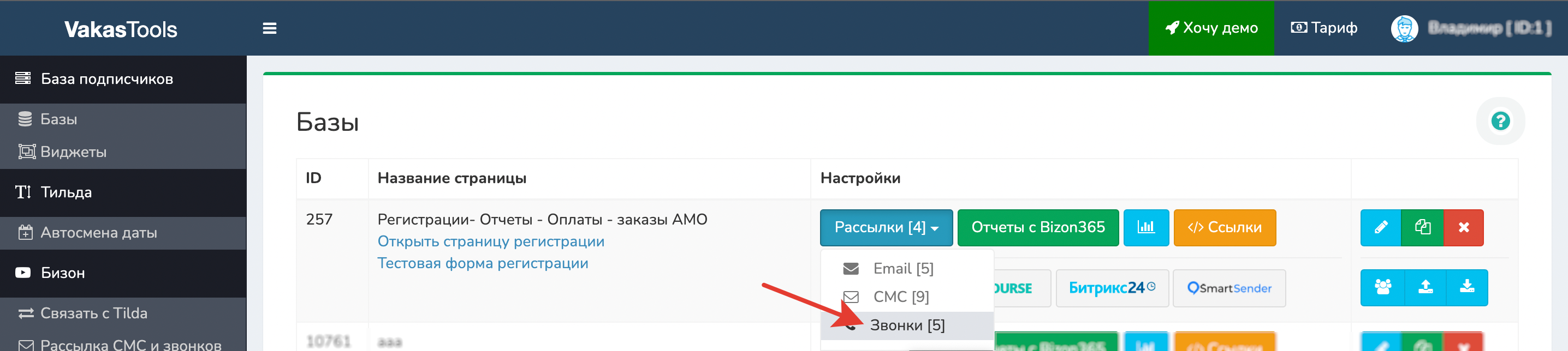 7 Рассылку звонков настраиваем аналогичным образом. Зайдите в раздел «Базы», выберите «Рассылка» - «Звонки»
