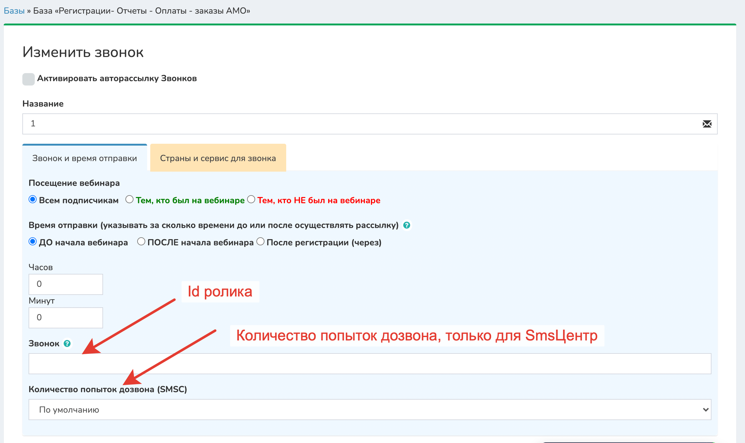Если используется сервис Звонопес, Zvonobot, указывается id ролика. Он должен обязательно пройти модерацию. Для сервиса СМСЦентр указывается код. Подробнее, где взять код, смотрите ниже. Для сервиса twillio указывается ссылка на mp3 файл.