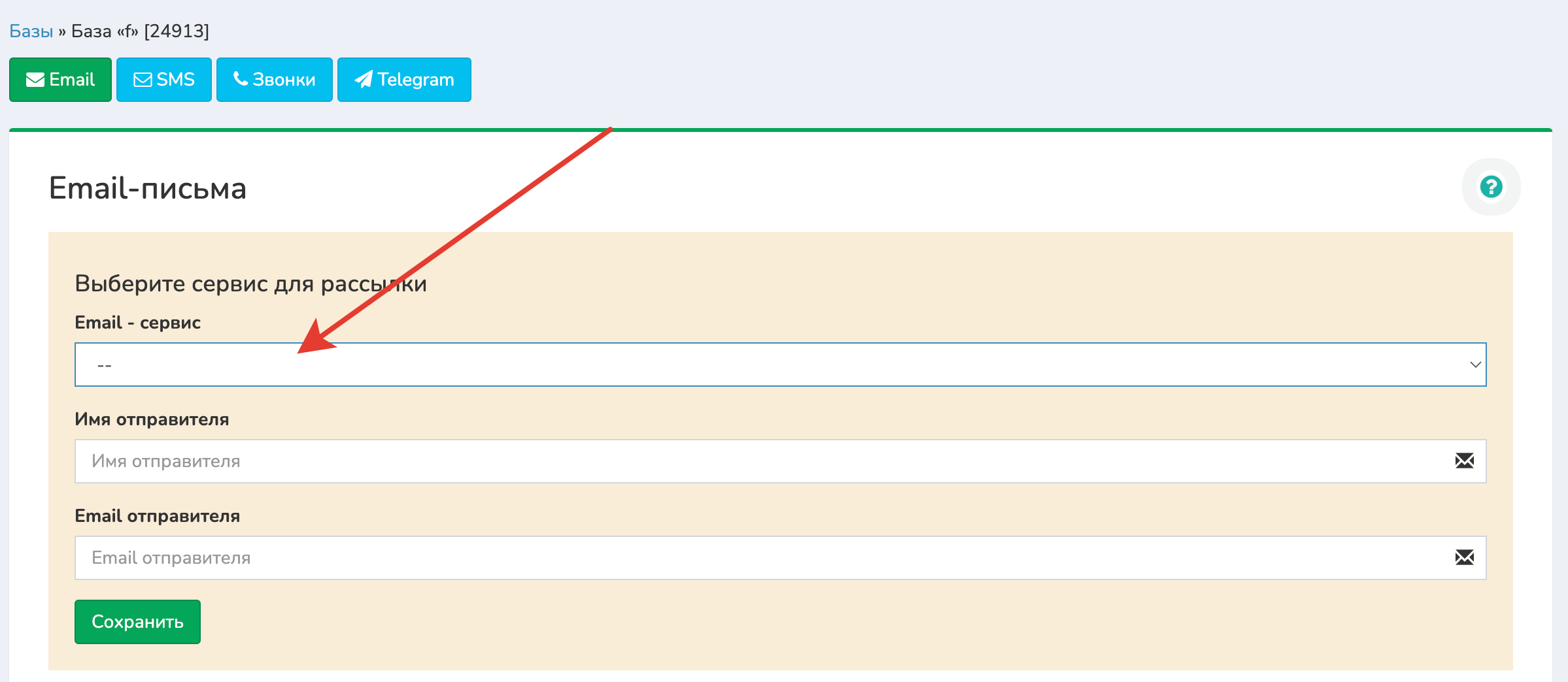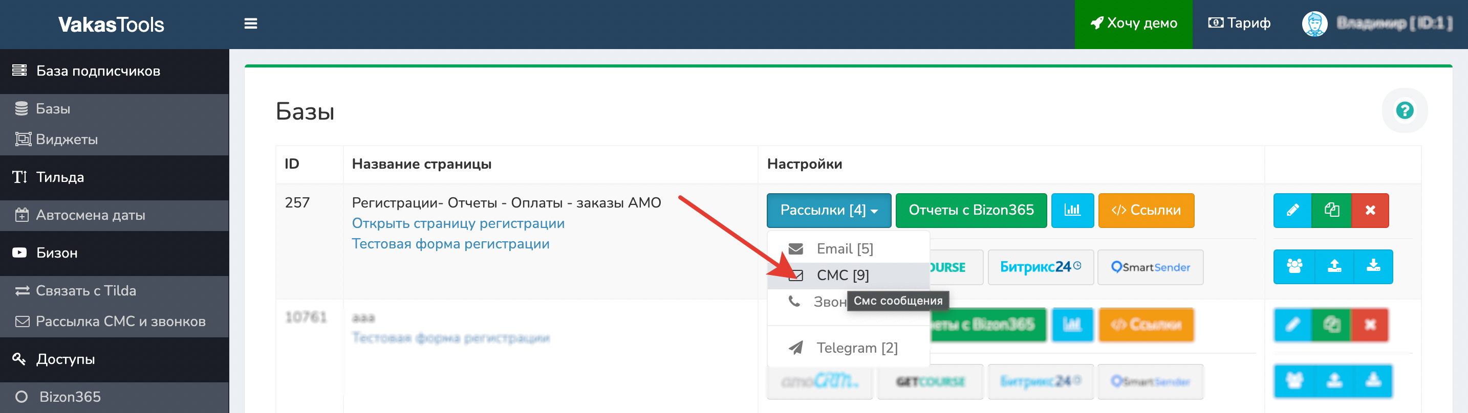1 Вернитесь в «Базы», перейдите в «Рассылки» - «СМС»