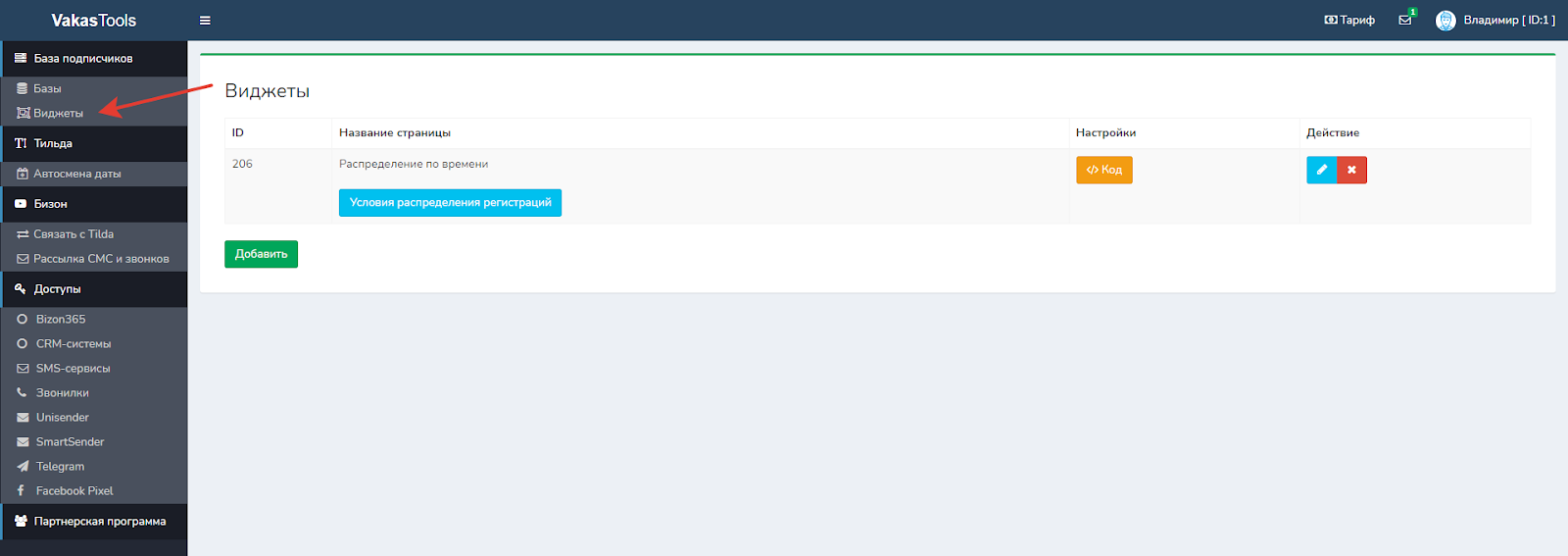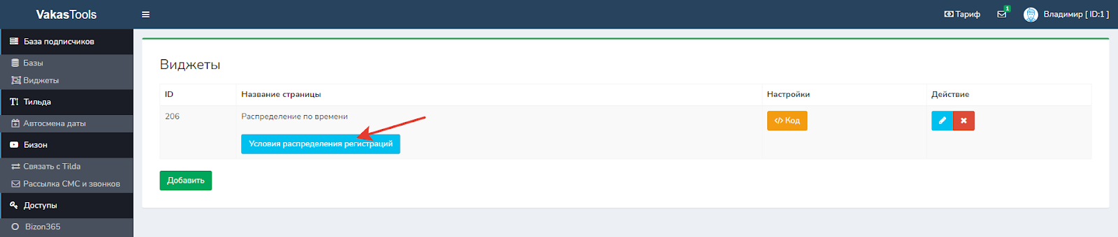 5. У нужного виджета добавляем условия распределения, для этого нажимаете кнопку [Условия распределения регистраций].