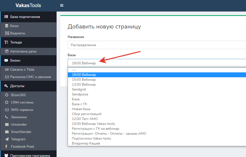 4. Выбираете базу по умолчанию, в нее будут падать регистрации, для которых не выполнились условия для распределения по времени. Например: выбираем на 18 часов.