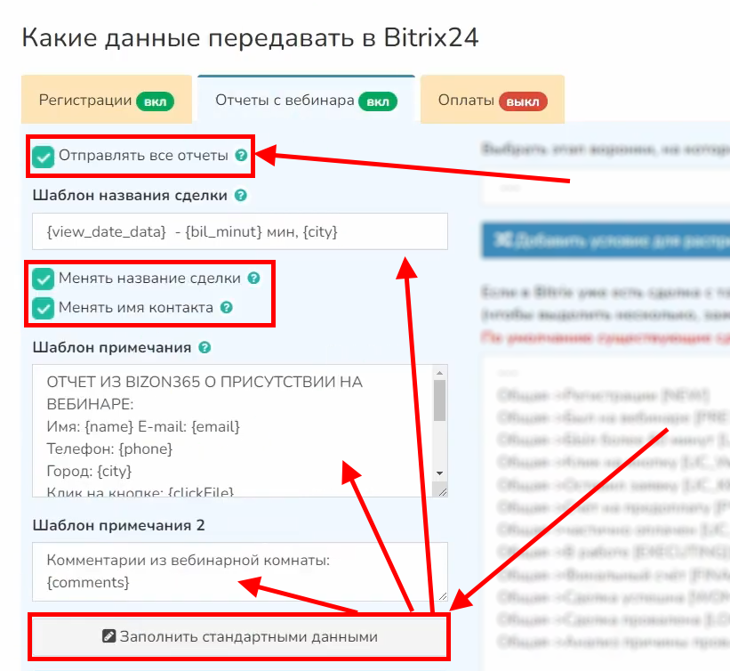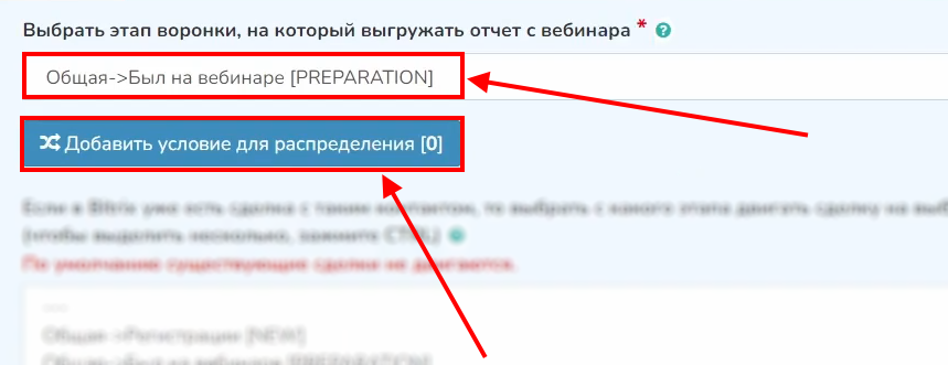Выберите этап воронки, на который будет выгружаться отчет с вебинара (обязательное поле).