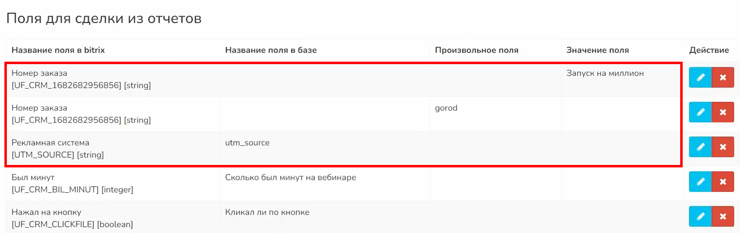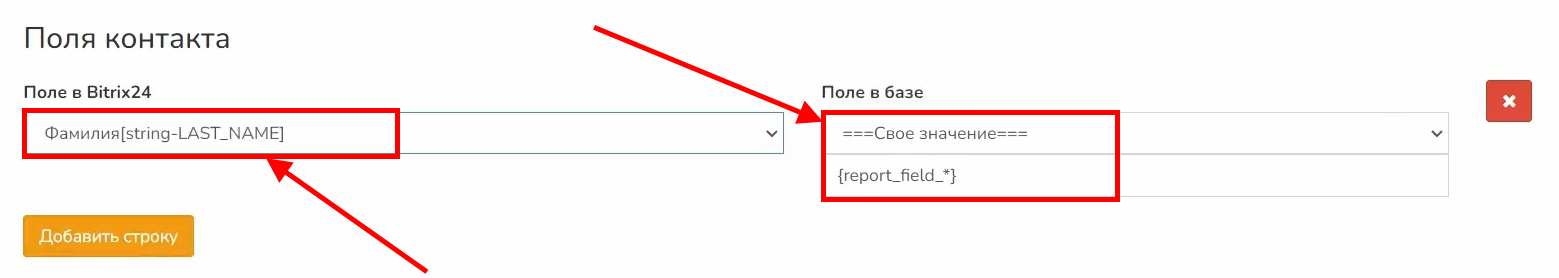 Нажмите на кнопку «Настройка полей у контакта». Выберите поле в Bitrix24, в которое необходимо передать данные. В «Поле в Базе» выберите «Свое значение» и укажите шорткод{report_field_*}. В шорткоде вместо * необходимо указать имя переменной, в которую записываются запрашиваемые данные.