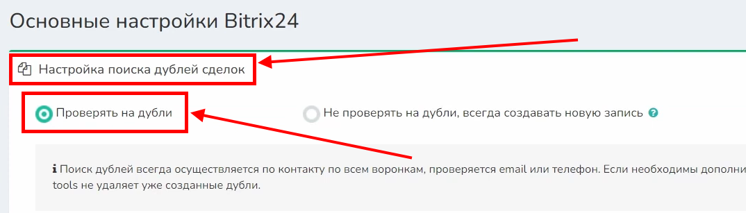 По умолчанию в настройках Bitrix24 в Vakas-tools включена проверка на дубли. Поиск дублей осуществляется по контактам (email, номер телефона) по всем воронкам. Если будет обнаружен email или номер телефона в одной из сделок, то данная сделка обновится, иначе будет создана новая сделка.