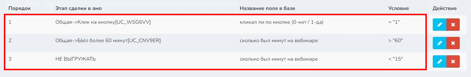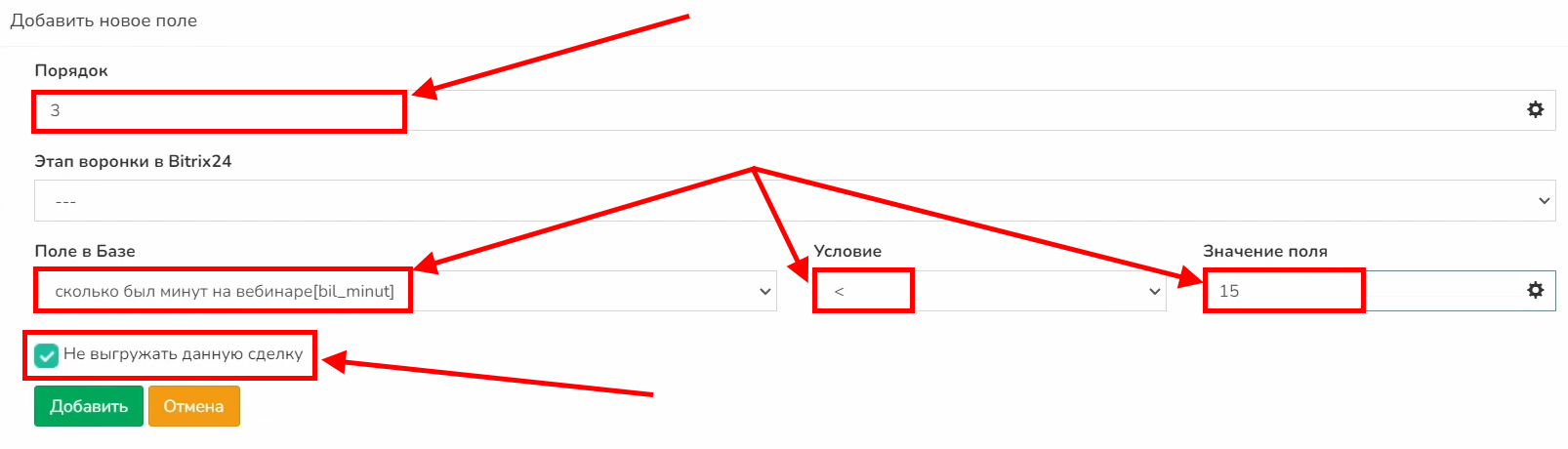 Если не нужно выгружать какие-то отчеты, то после выбора условия установите галочку «Не выгружать данную сделку». Например, укажите условие «был на вебинаре < 15». Таким образом, все, кто был на вебинаре меньше 15 минут, выгружаться не будут. Остальные, не попавшие под условия, выгрузятся в основной этап «Был на вебинаре».
