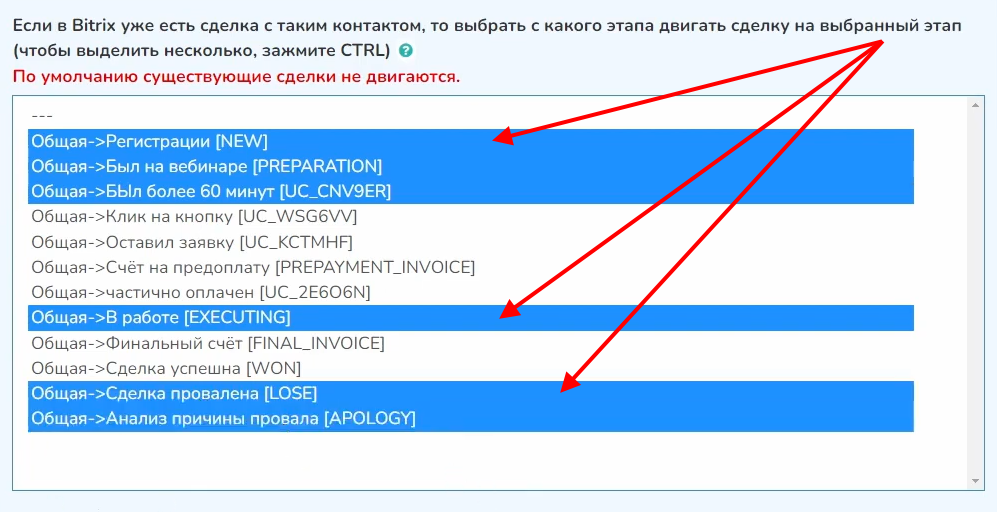 Выберите этапы воронки, с которых будут перемещаться сделки на выбранный основной этап либо этапы для распределения, если в Bitrix24 уже есть сделка с указанным контактом. Для выбора нескольких этапов зажмите CTRL. Если сделка будет находиться на этапе, который не был выбран, данные в ней обновятся, но она останется на прежнем этапе. Между воронками сделки не перемещаются.