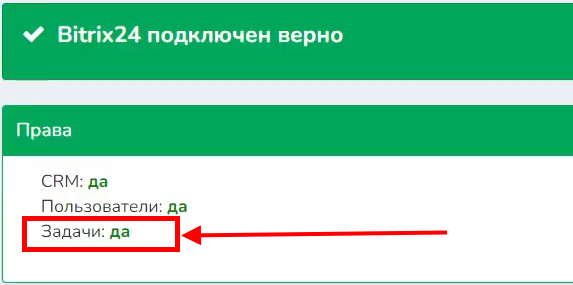 Чтобы создавать задачи, в настройках Bitrix24 должны быть выданы права на задачи.
