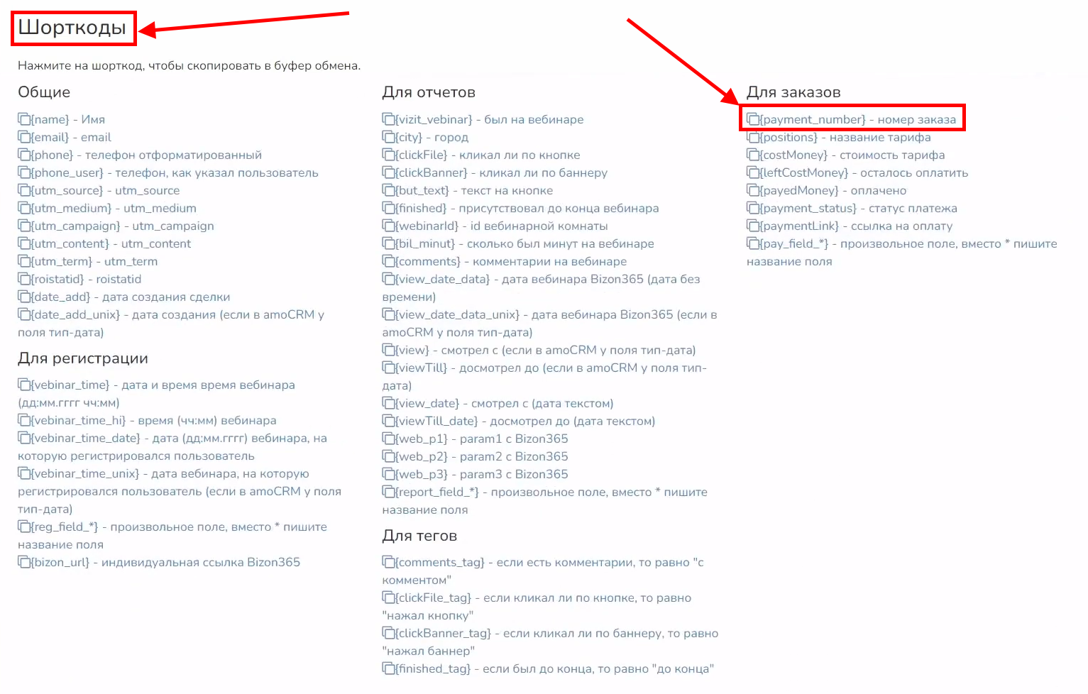Шорткоды указаны на странице ниже. Для копирования шорткода нажмите на него. Использовать шорткоды необходимо с фигурными скобками {} без пробелов, иначе они не будут работать.