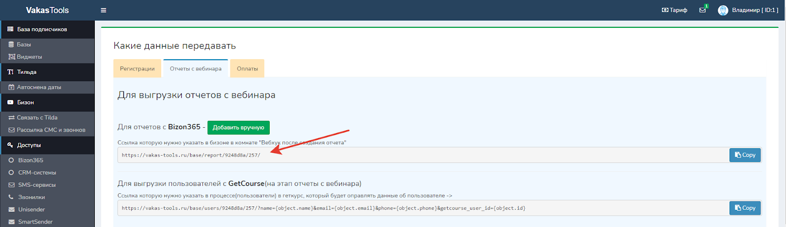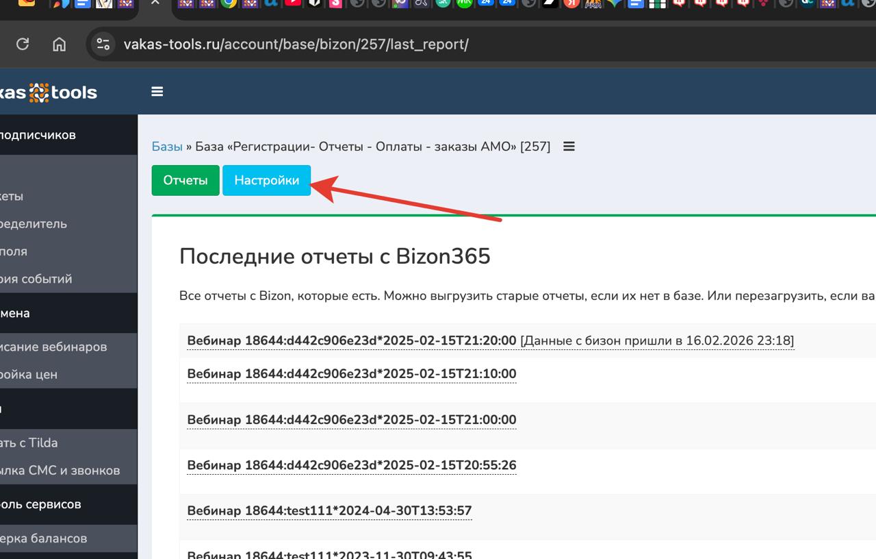 Документация / Передача отчетов после вебинара / Выгрузка отчетов с Bizon365 в Vakas-tools