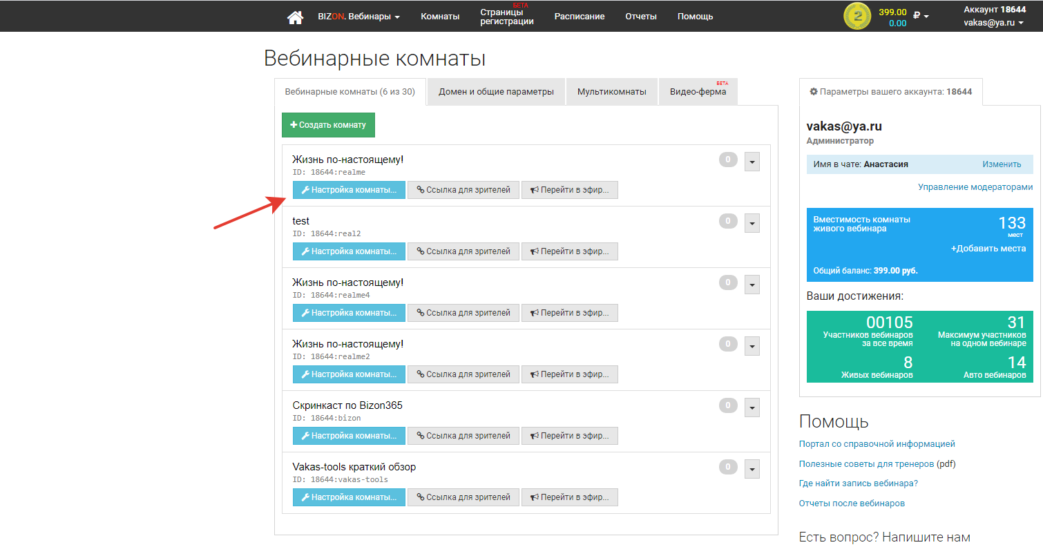 Настройки комнаты в Bizon365