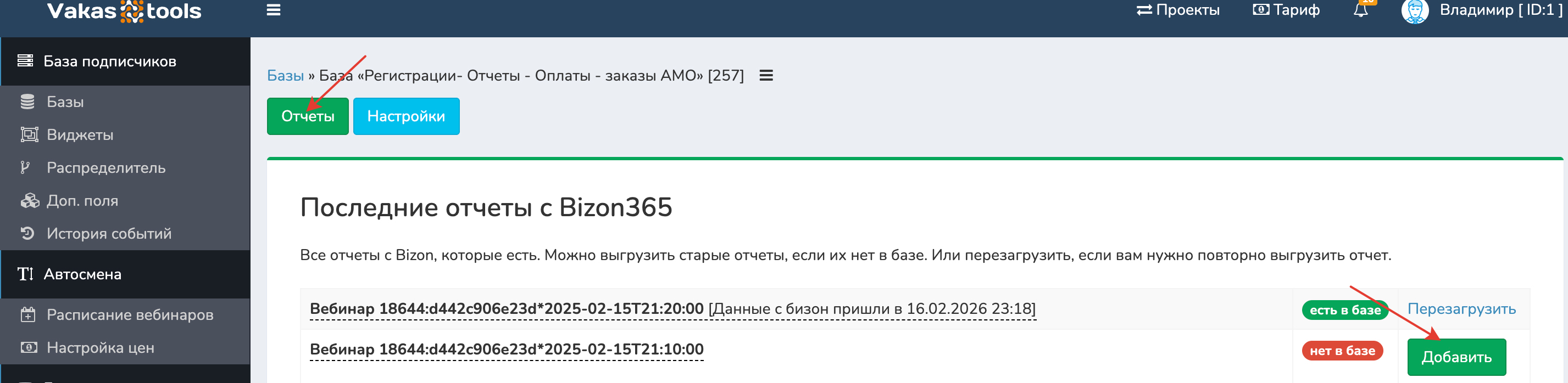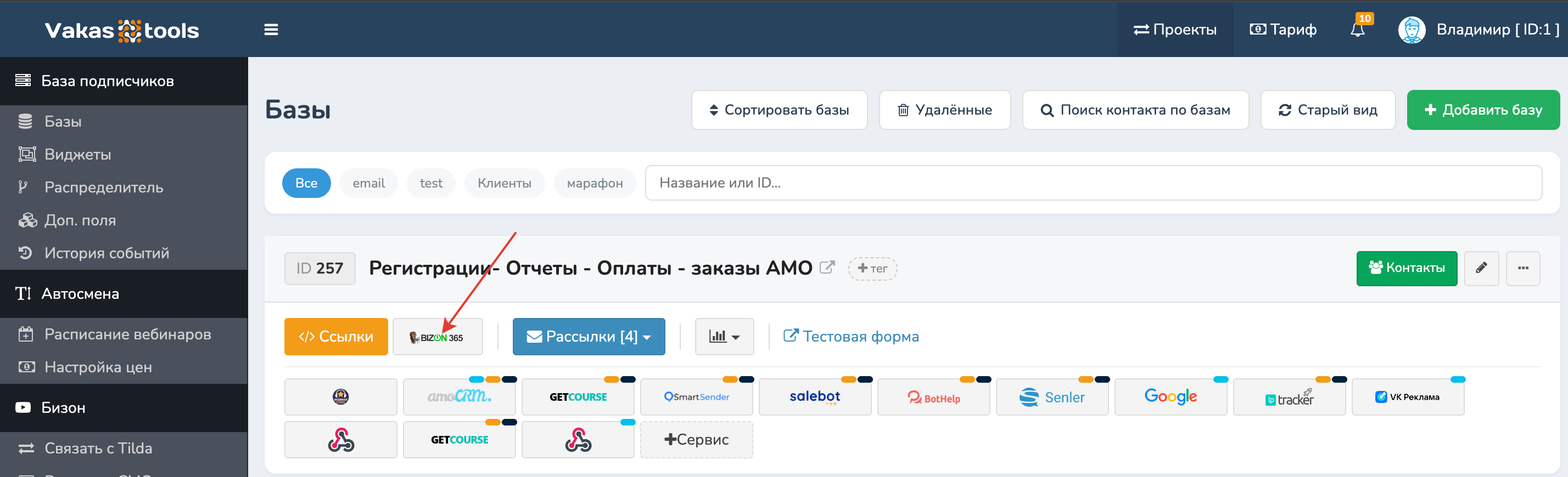 Переходите в Базы по кнопке [Отчеты с Bizon365]