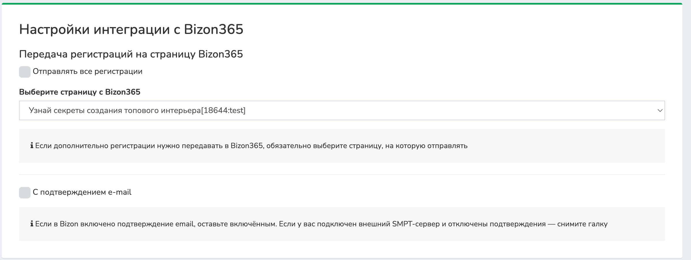 Если вы планируете передавать регистрации на страницу в Bizon365, включите галочку «Отправлять регистрации в страницу Bizon365». После этого обязательно выберите нужную страницу в выпадающем списке «Со страницы Bizon365»