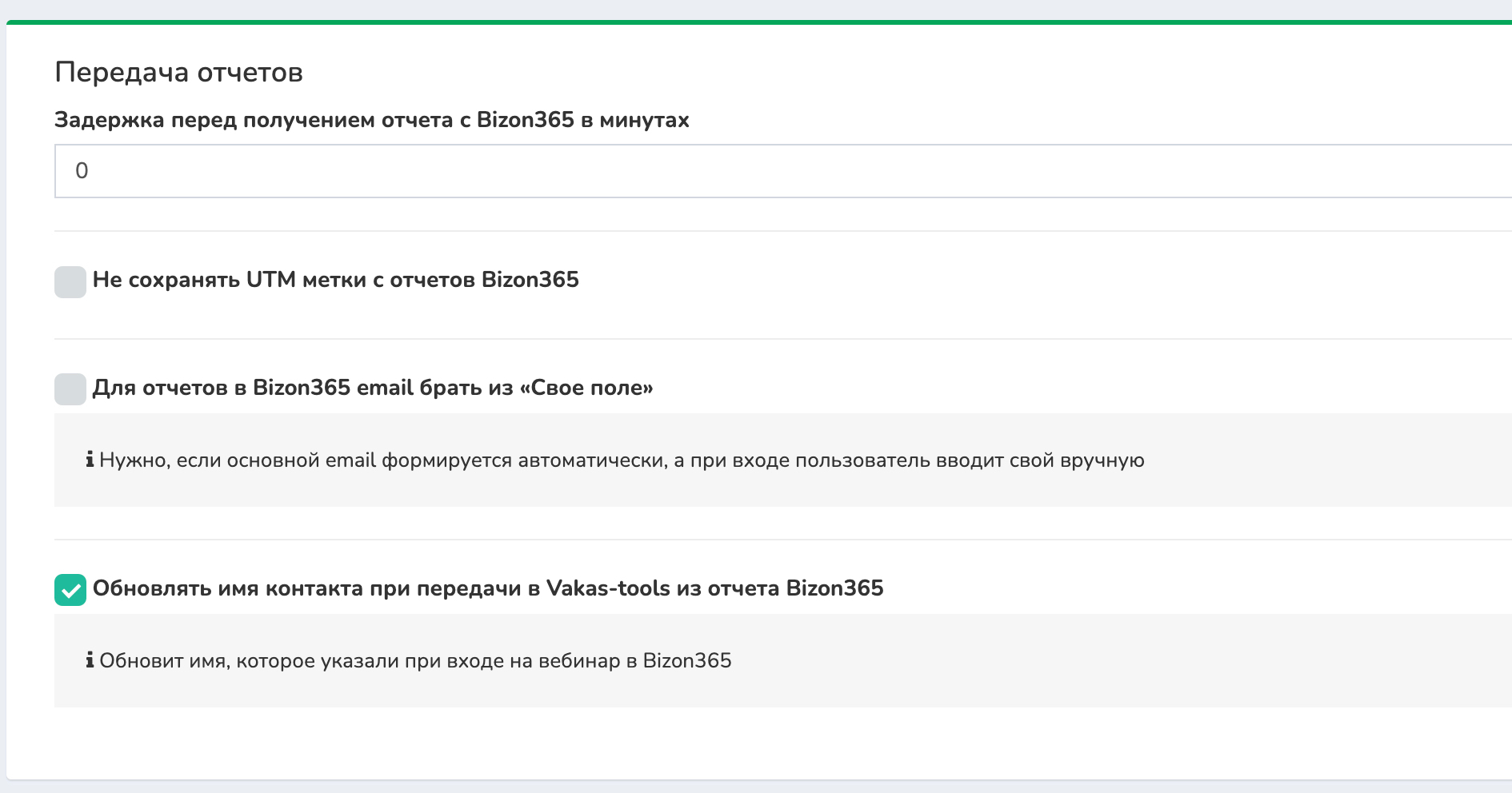 Галочка Обновлять имя контакта при передачи в vakas-tools из отчета Bizon365 - если изначально у вас данные при регистрации попадают с неправильным именем, то в отчет передается имя, которое указали при входе на вебинар в Bizon365.