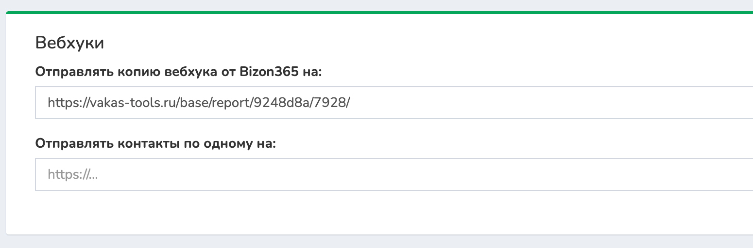 Поле Отправлять копию вебхука от Bizon365 на - используется, если отчеты из Bizon365 нужно отправлять не только в Vakas-tools, но и в другой сервис или в другую Базу. Как работает: в Bizon365 вы указываете основной вебхук (как обычно — на первую Базу). В этом поле можно указать дополнительный вебхук. В результате один и тот же отчет будет отправлен сразу в два места.