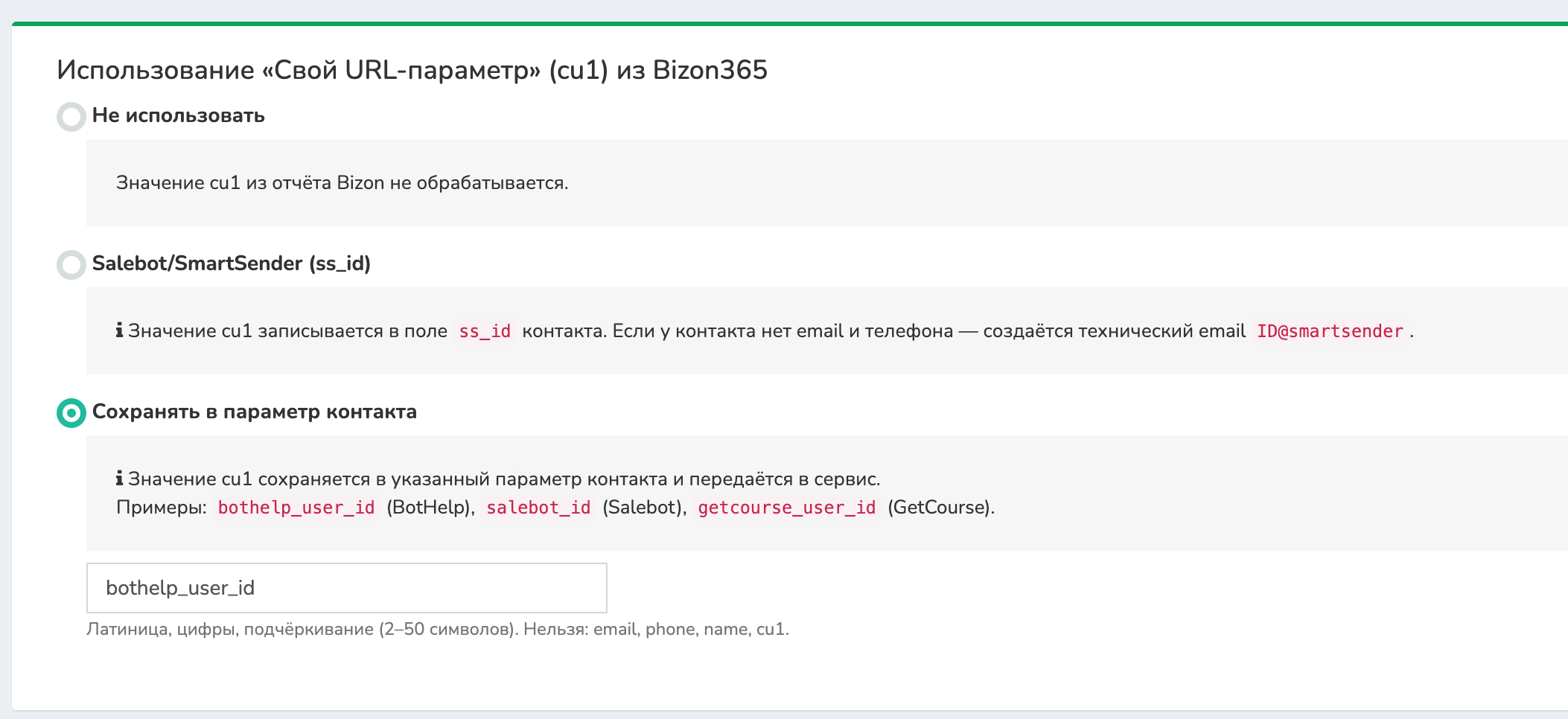 Значение cu1 автоматически записывается в поле ss_id контакта. Если у контакта отсутствуют email и телефон, создается технический email вида ID@smartsender, чтобы контакт можно было сохранить в системе. Используйте этот вариант, если работаете с Salebot или SmartSender и передаете их ID через cu1.