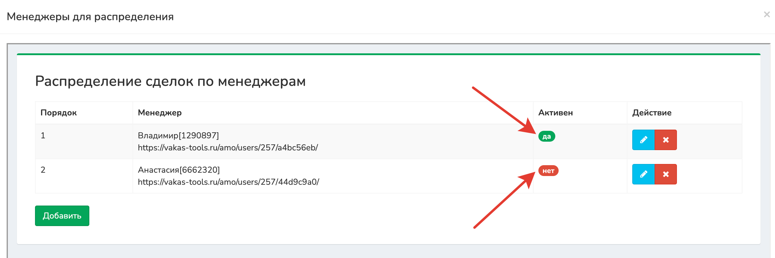 3 Поставьте галочку «Активен» у нужного менеджера