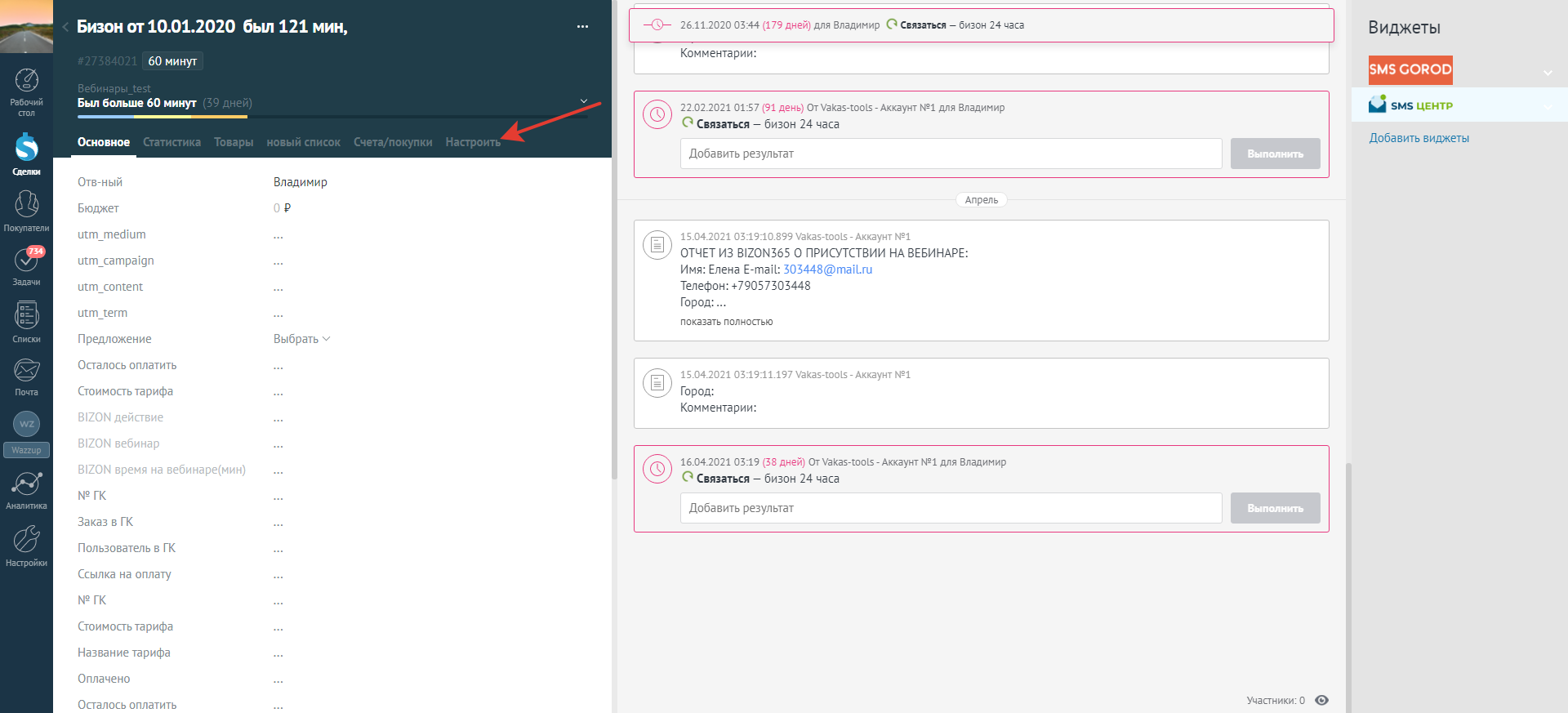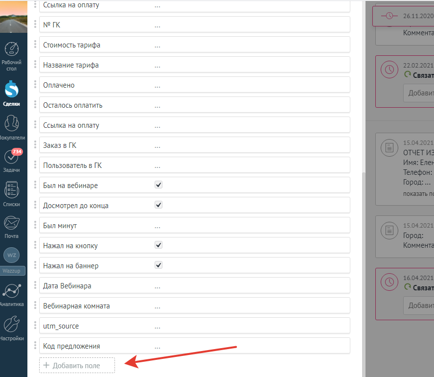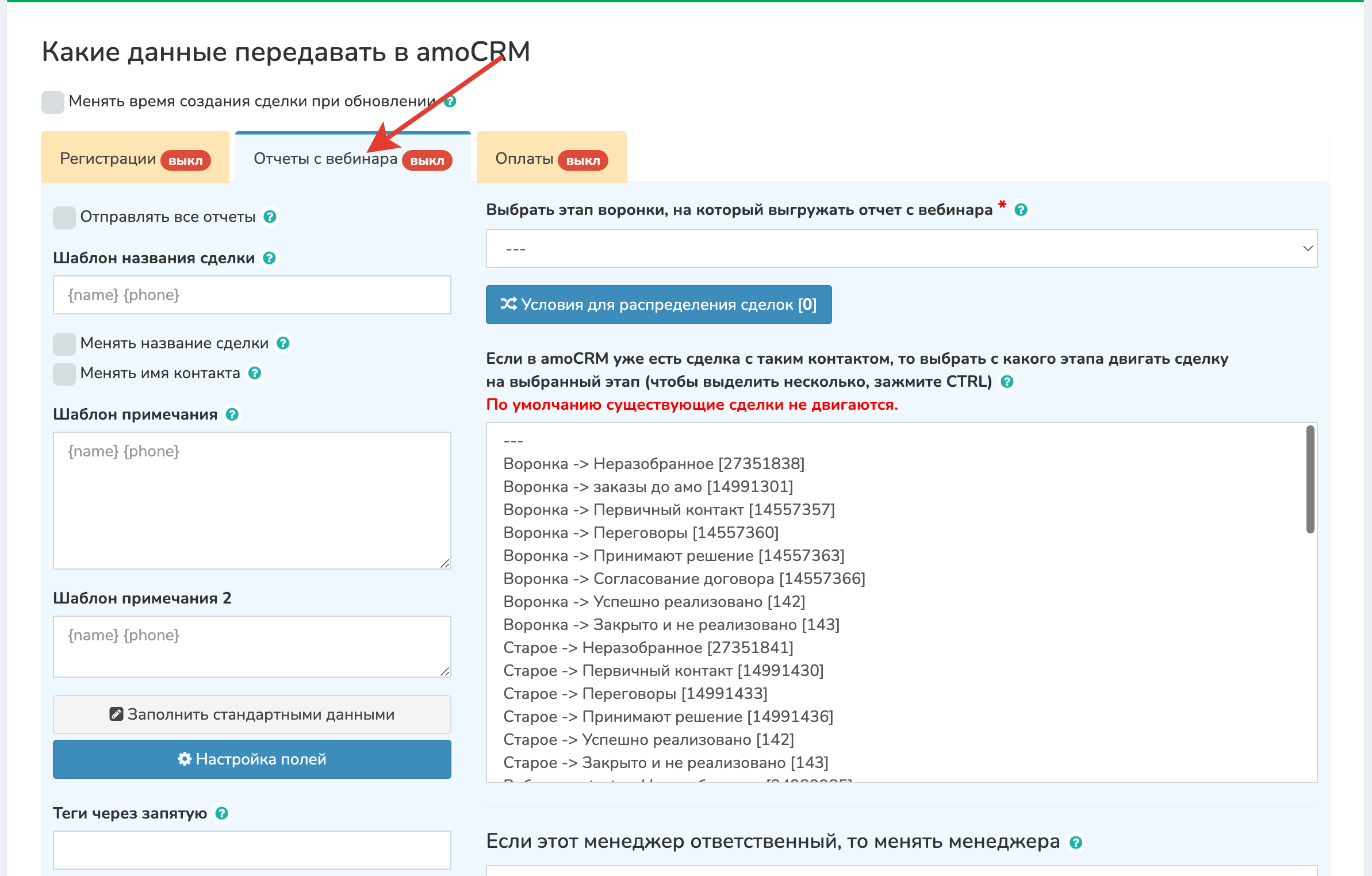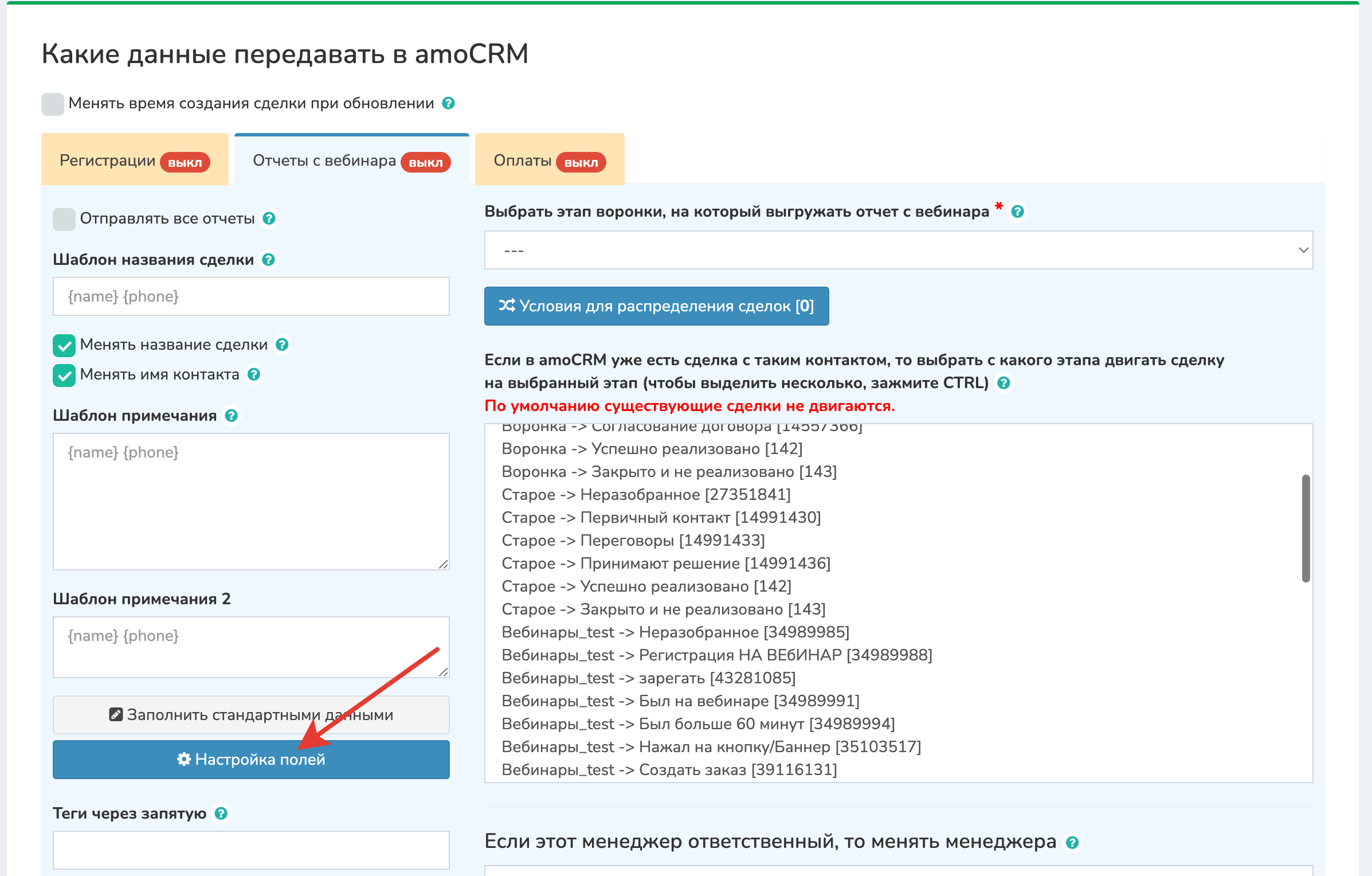 1 Во вкладке «Отчеты с вебинара» нажмите кнопку [Настройка полей у сделки]