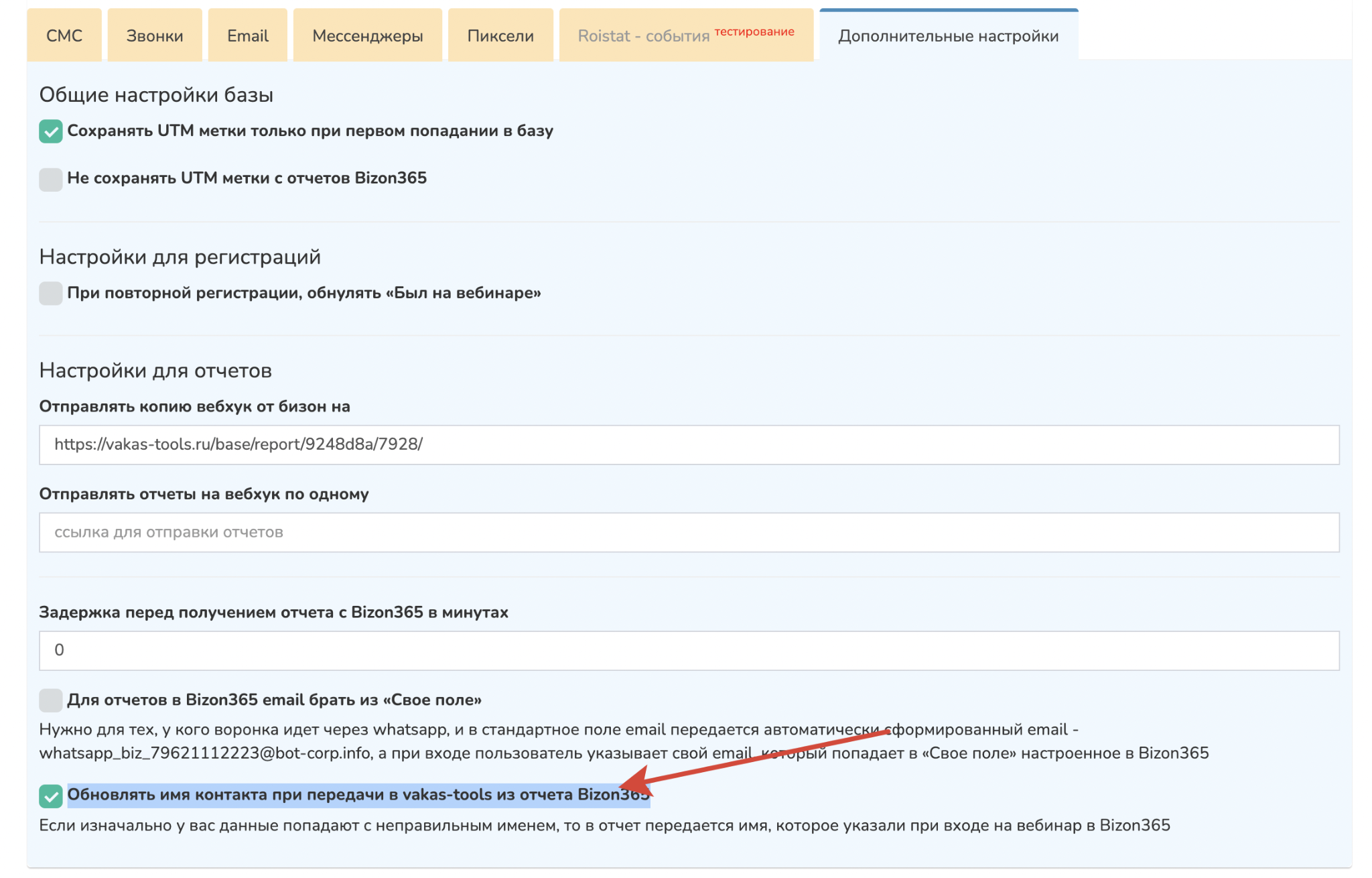 Дополнительно, чтобы имя менялось, необходимо в настройках нужной Базы поставить галочку. Переходите в редактирование Базы и в «Дополнительных настройках» отмечаете галочку «Обновлять имя контакта при передачи в vakas-tools из отчета Bizon365».