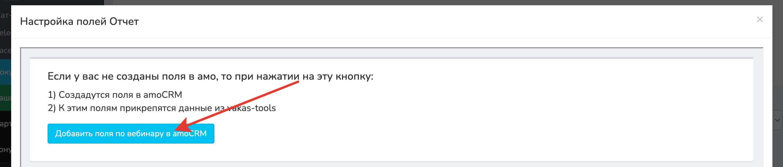 2 Если нет нужных полей — нажмите [Добавить поля по вебинару в amoCRM]