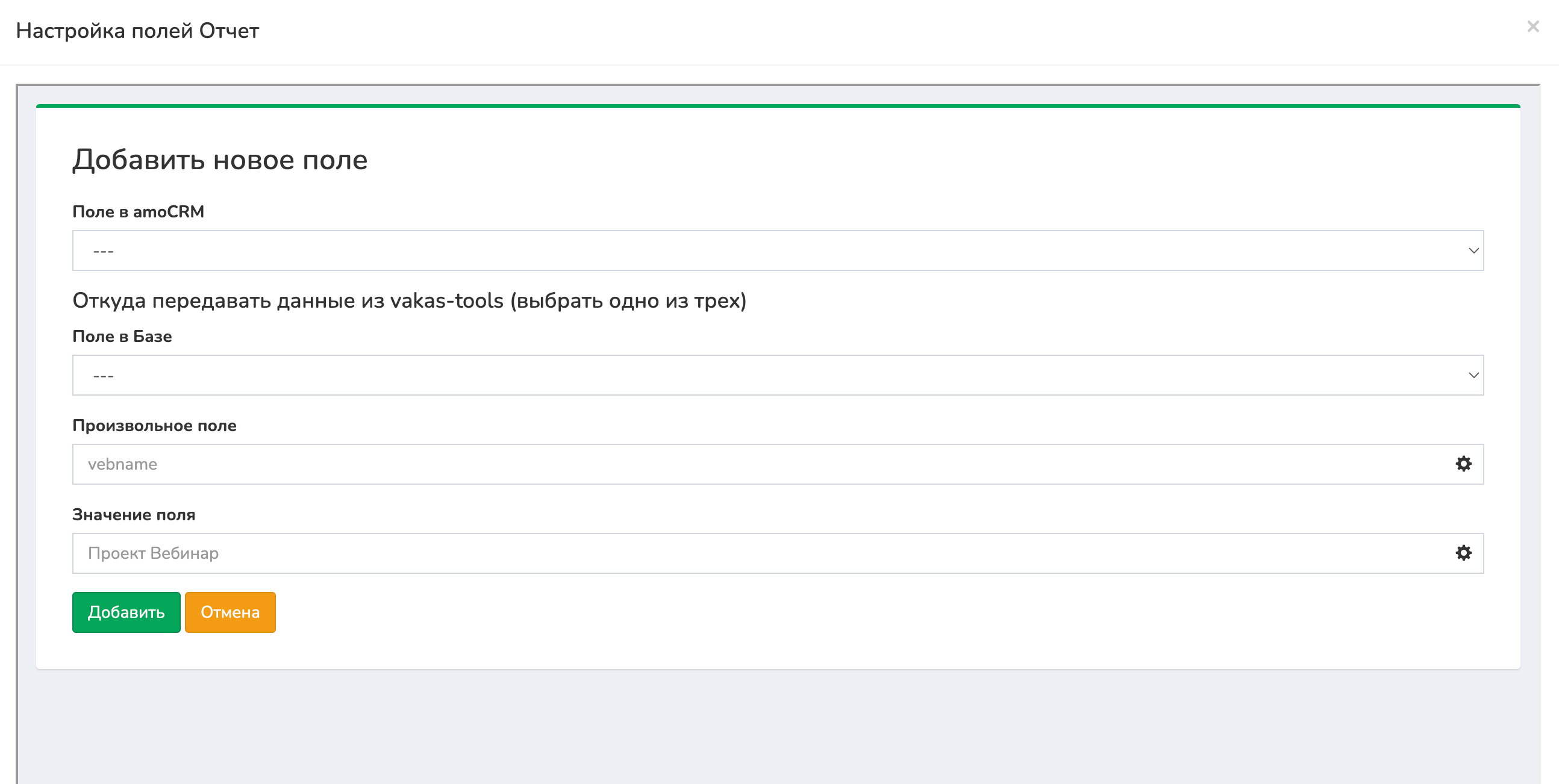 Второй вариант: если у вас есть дополнительные поля, которых нет в vakas-tools (т.е. в выпадающем списке «Поле в Базе»), то вы можете передать его в amo, указав его значение в «Произвольное поле».
